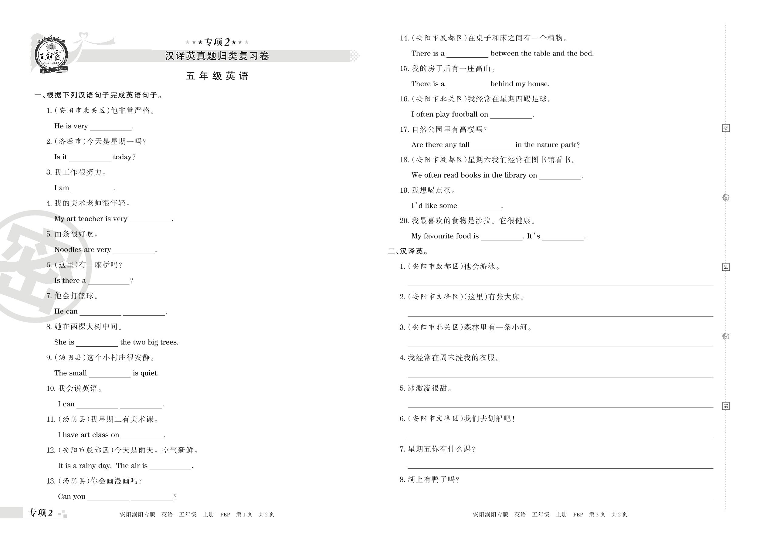 王朝霞期末专项卷——汉译英真题归类复习卷五年级上册英语(人教PEP版)【2】