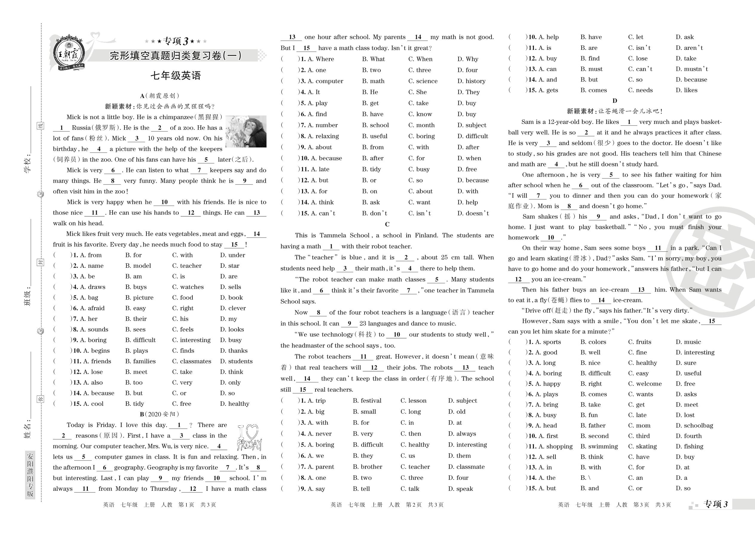 王朝霞期末专项卷——完形填空真题归类复习卷(一)七年级上册英语(人教版)_R211123152818151【3】