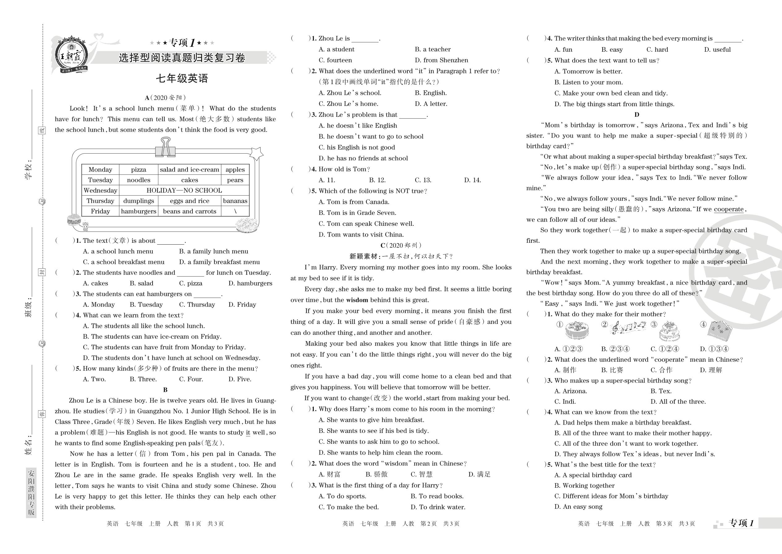 王朝霞期末专项卷——选择型阅读真题归类复习卷七年级上册英语(人教版)_R211123152818371【1】