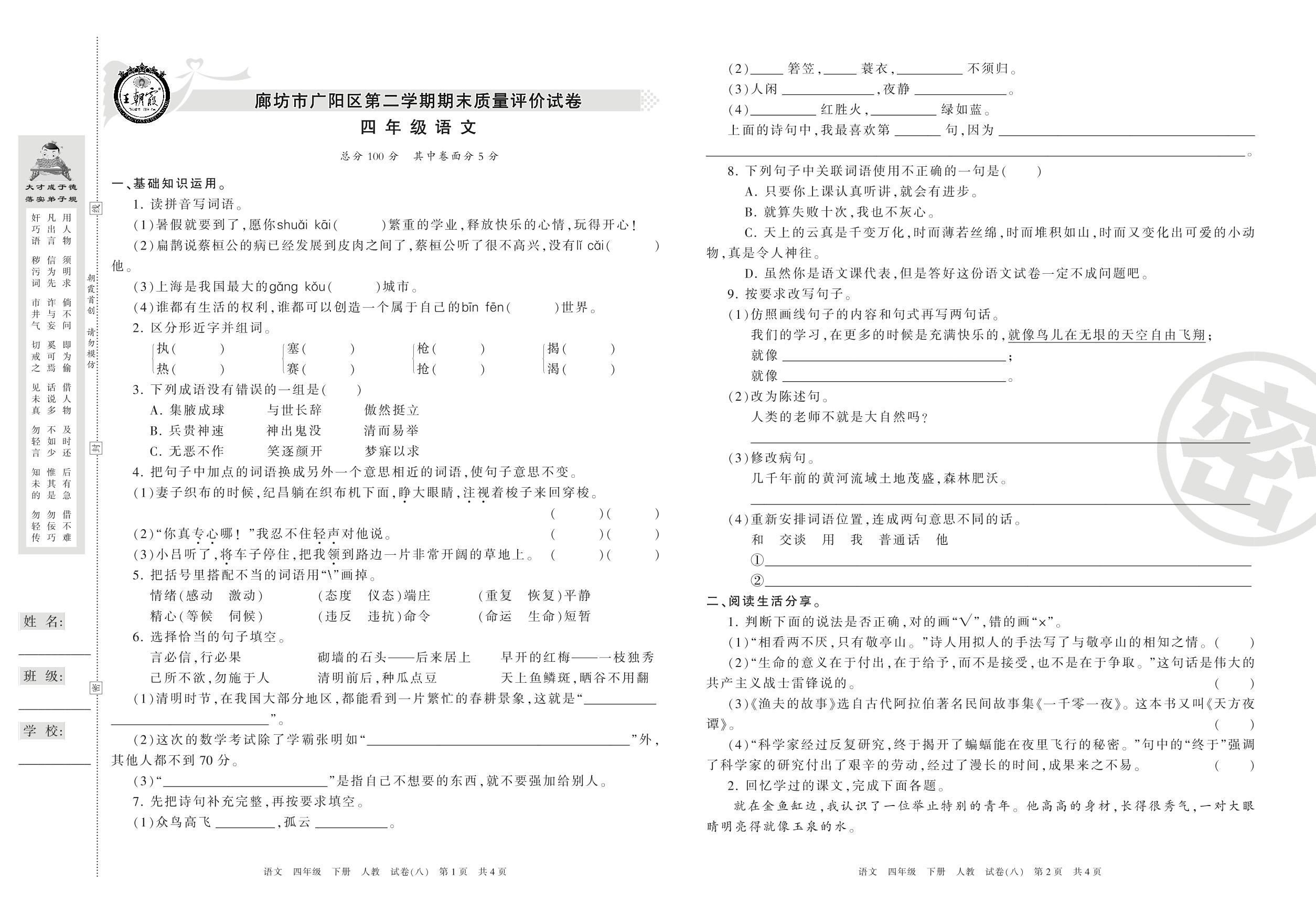 2015-2016学年第二学期廊坊市广阳区四年级语文试卷(人教版)【8】