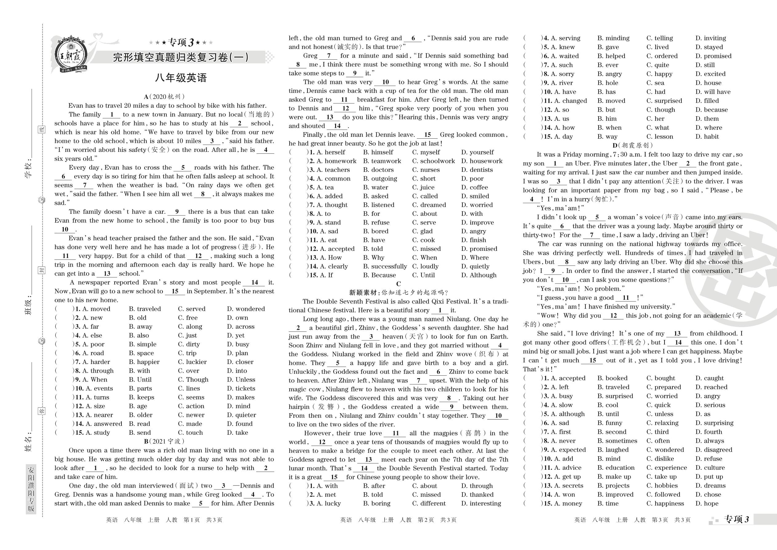 王朝霞期末专项卷——完形填空真题归类复习卷(一)八年级上册英语(人教版)_R211123153325795【3】
