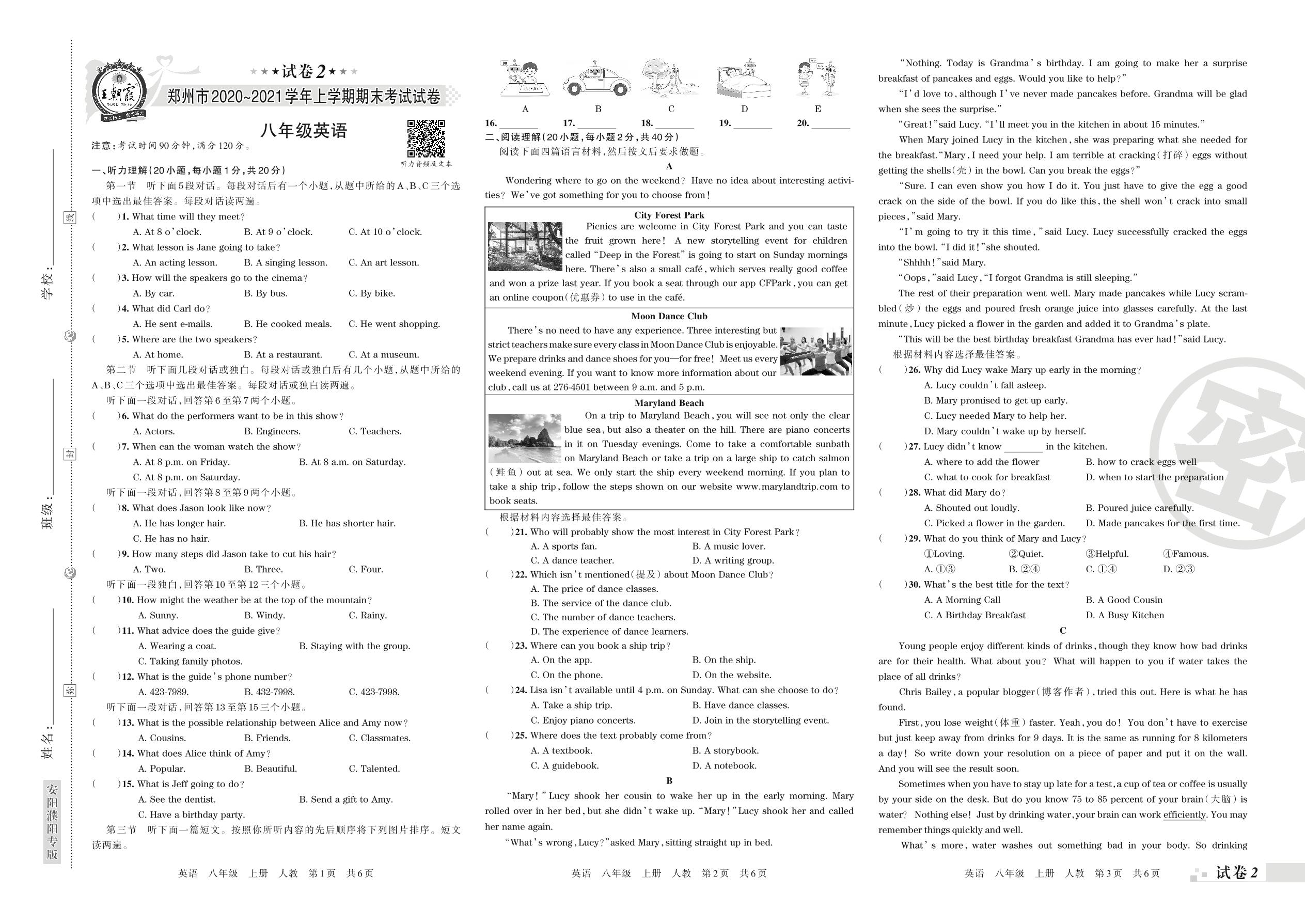 郑州市2020~2021学年上学期期末考试试卷八年级英语(人教版)【2】