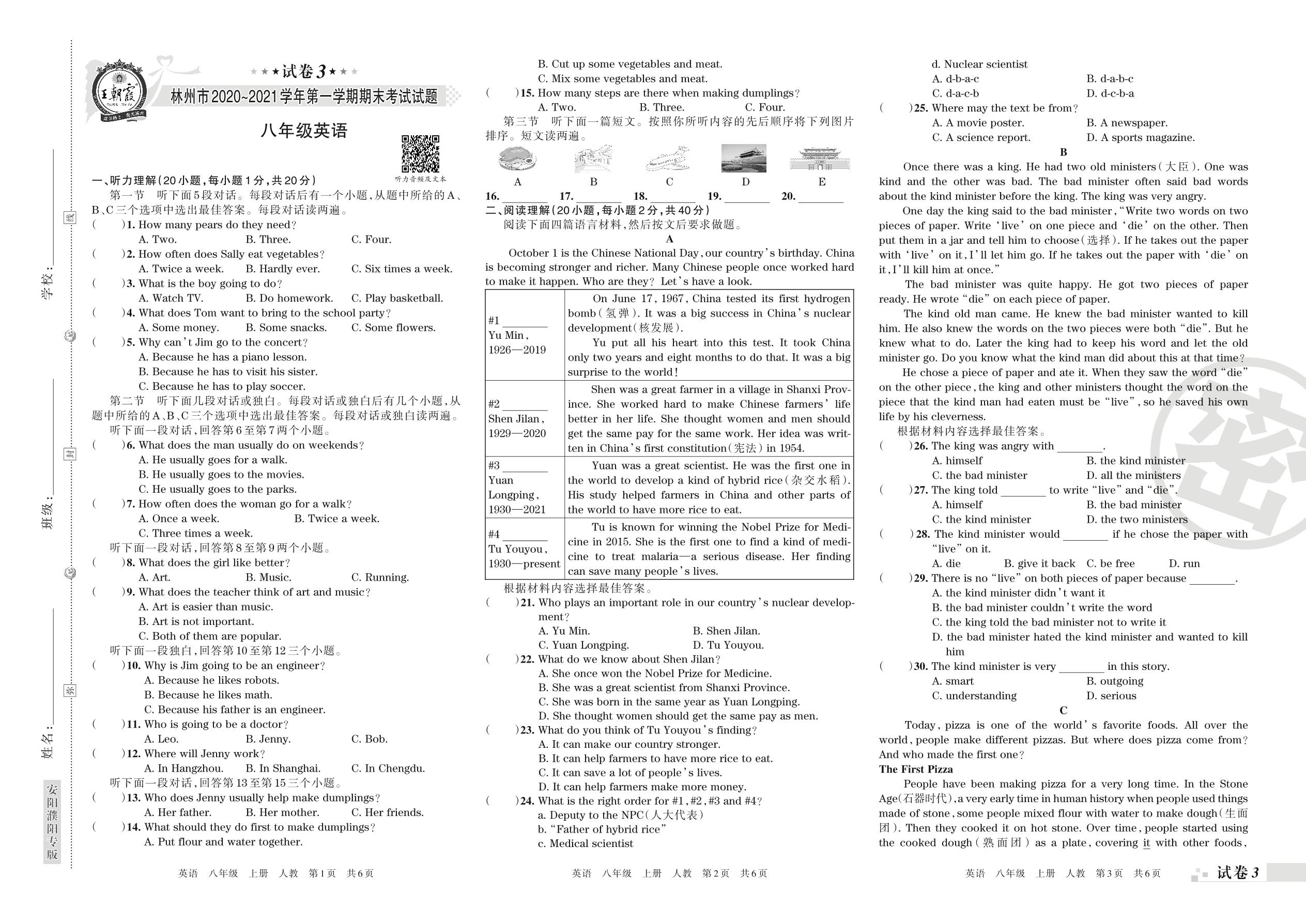 林州市2020~2021学年第一学期期末考试试题八年级英语(人教版)【3】