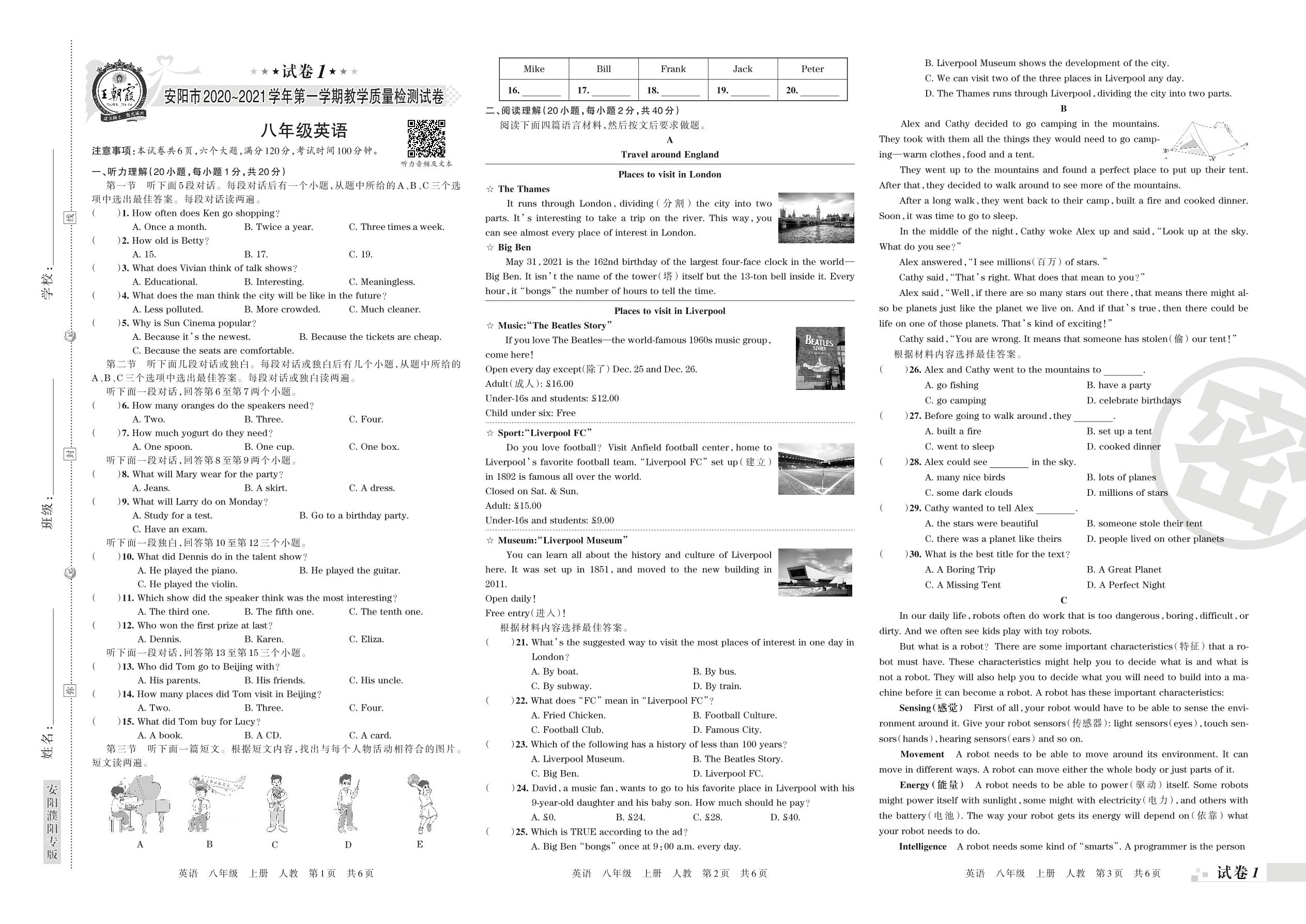 安阳市2020~2021学年第一学期教学质量检测试卷八年级英语(人教版)【1】