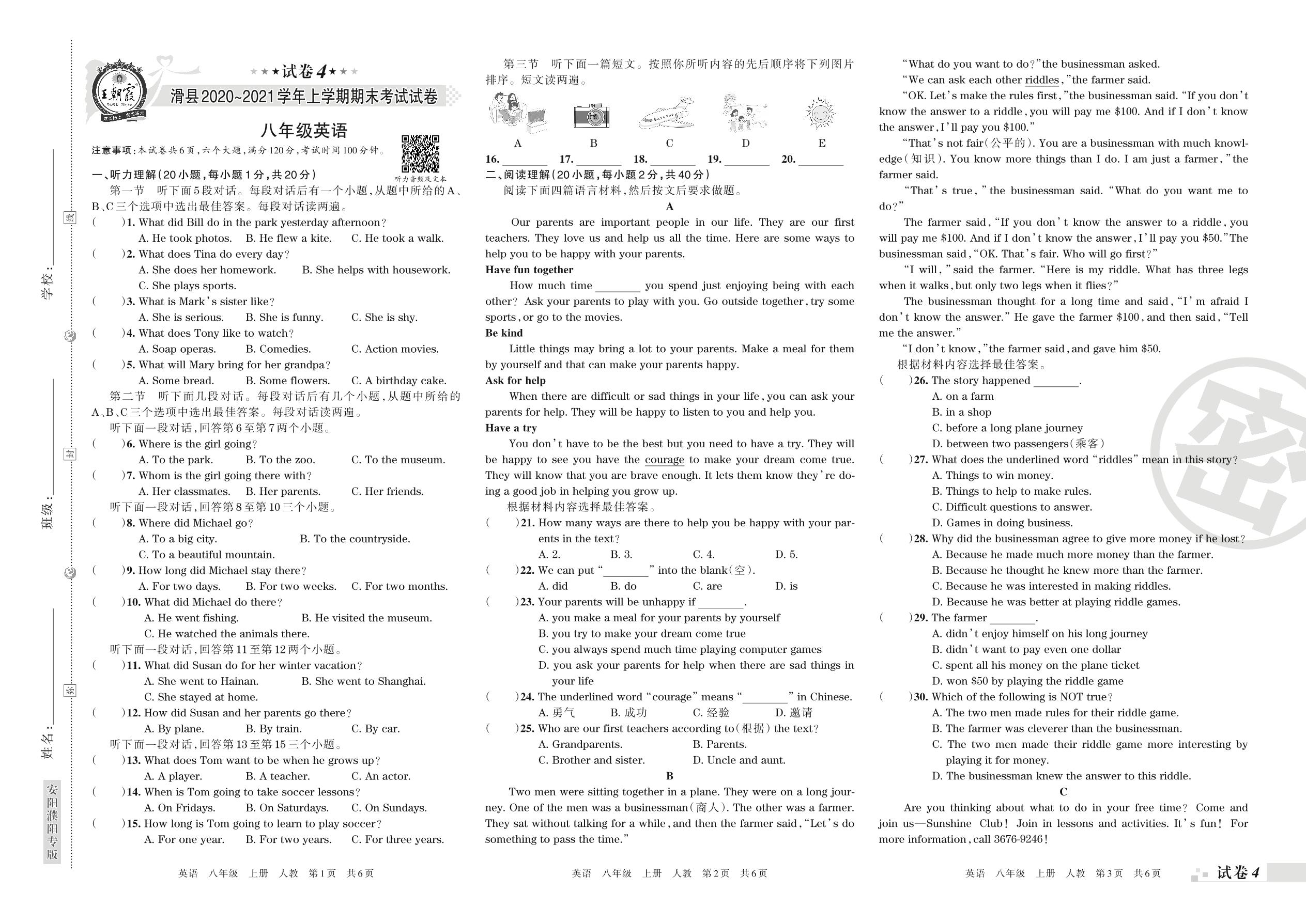 滑县2020~2021学年上学期期末考试试卷八年级英语(人教版)【4】
