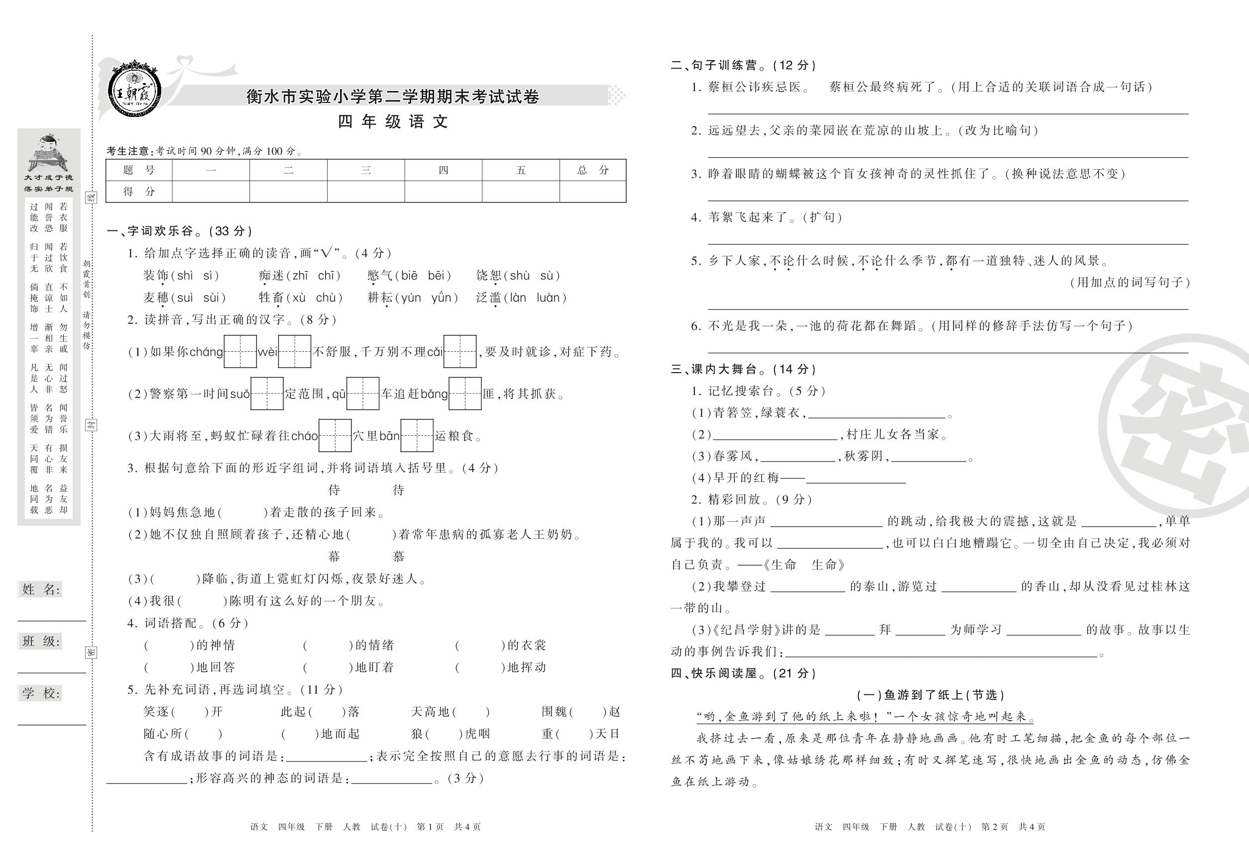 2015-2016学年第二学期衡水市四年级语文试卷(人教版)【10】
