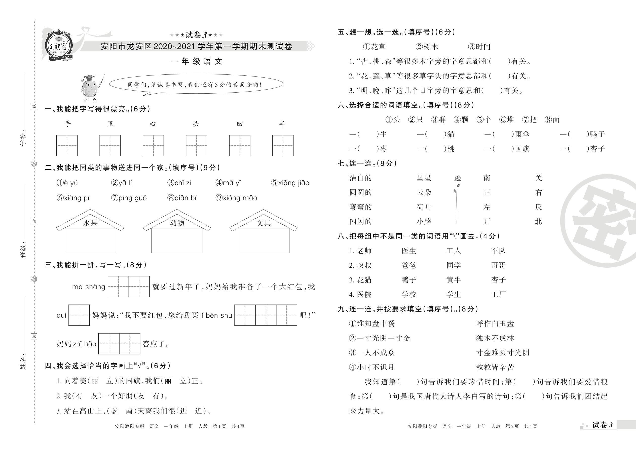 安阳市龙安区2020~2021学年第一学期期末测试卷一年级语文(人教版)【3】