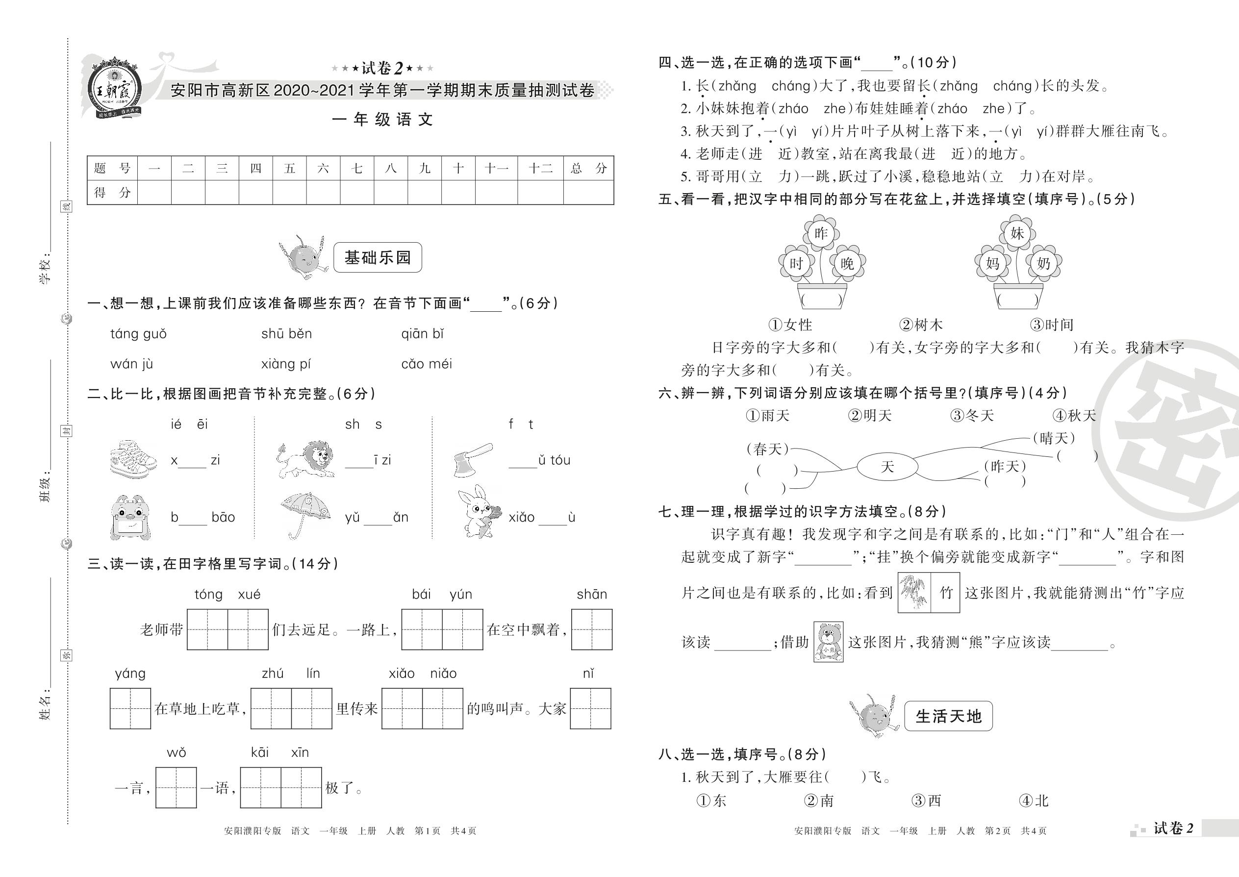 安阳市高新区2020~2021学年第一学期期末质量抽测试卷一年级语文(人教版)【2】