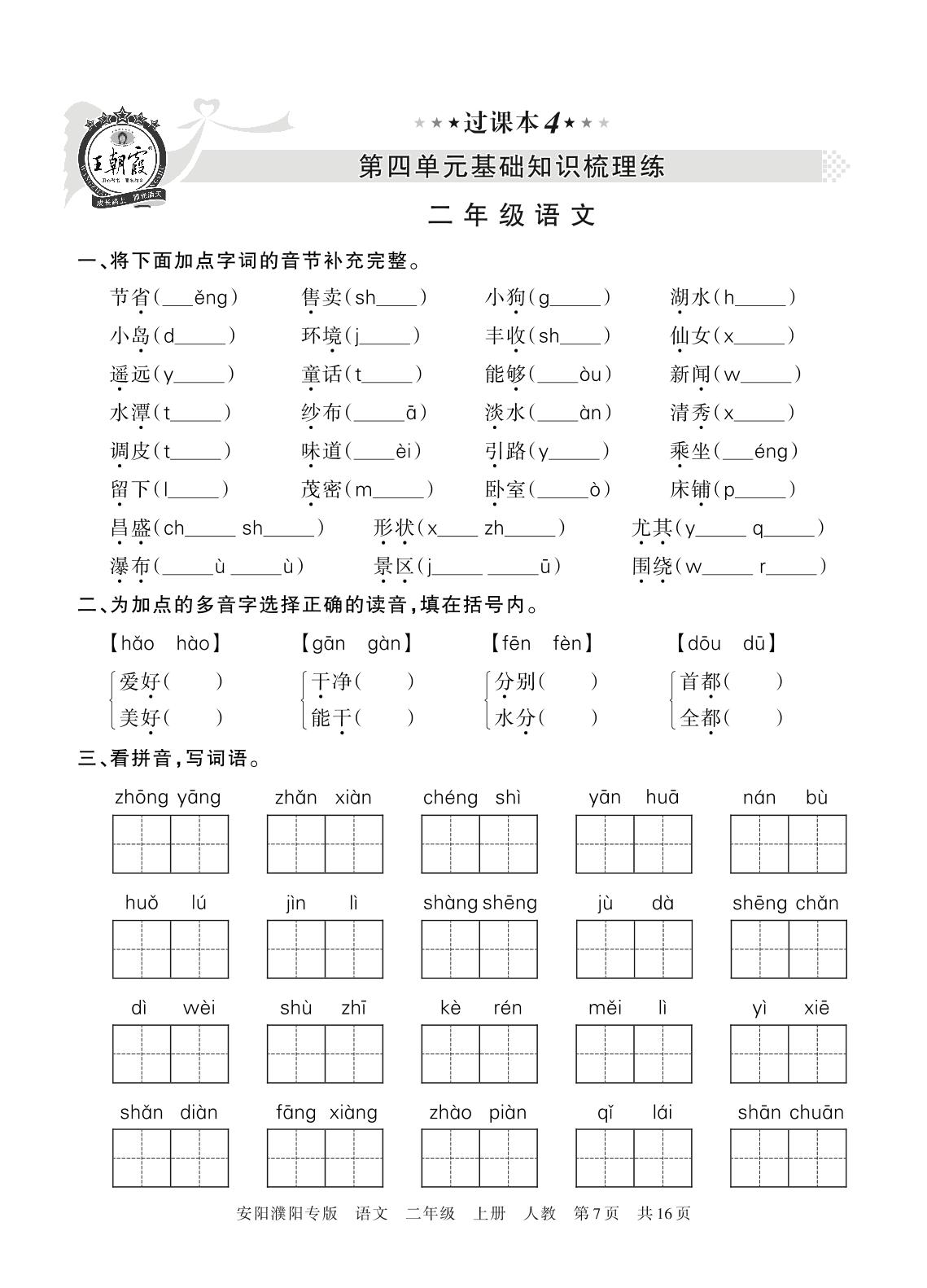 王朝霞期末过课本——第四单元基础知识梳理练二年级上册语文(人教版)_R211123154239806【4】