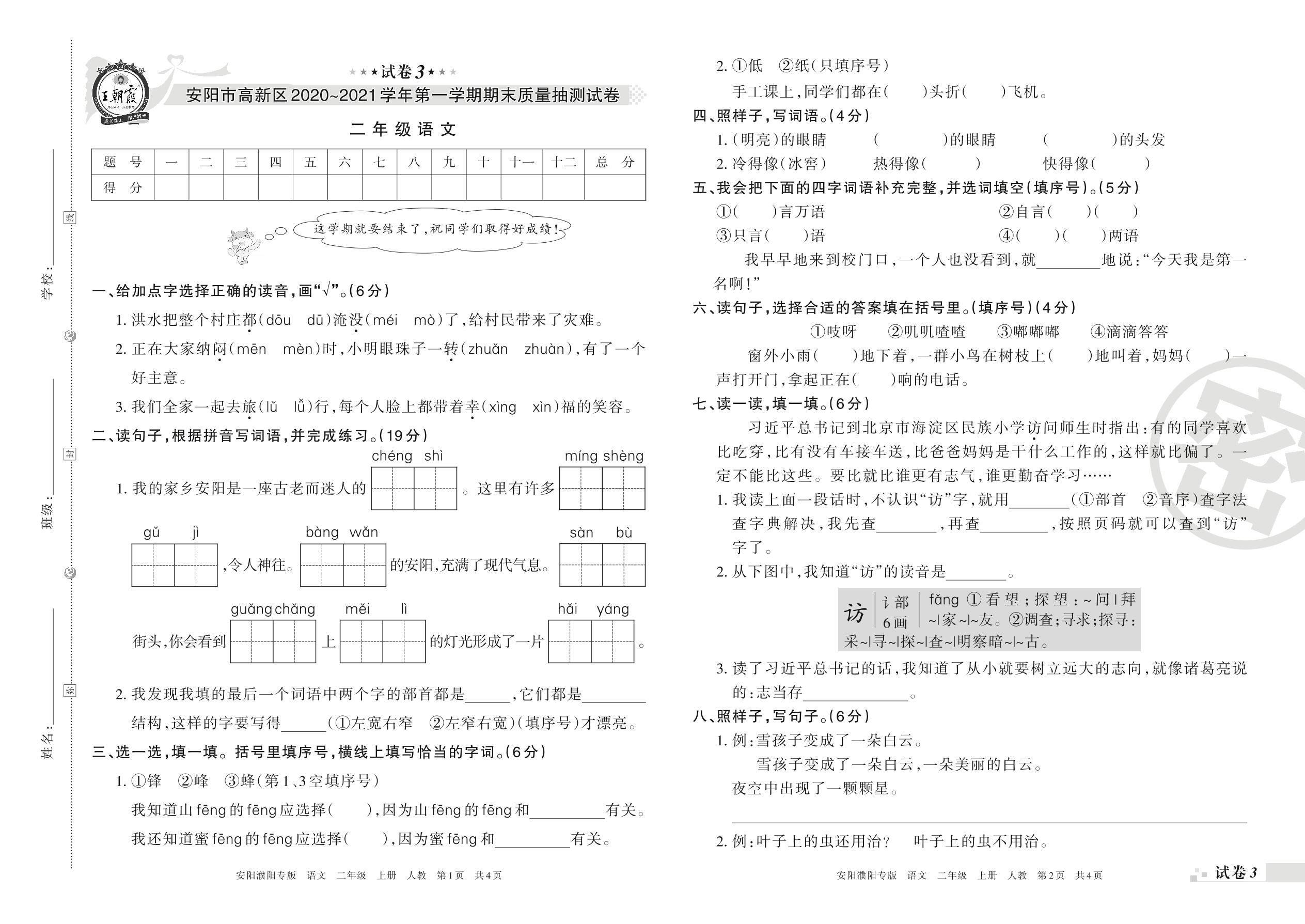 安阳市高新区2020~2021学年第一学期期末质量抽测试卷二年级语文(人教版)【3】