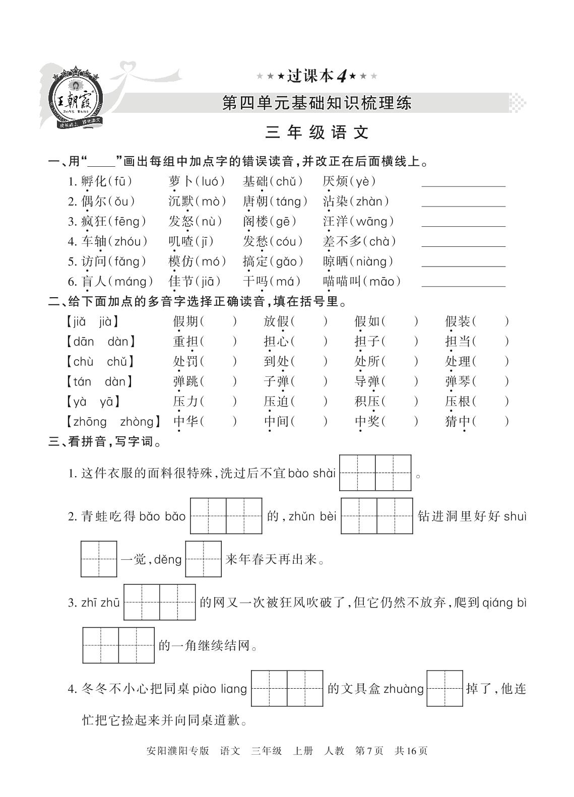 王朝霞期末过课本——第四单元基础知识梳理练三年级上册语文(人教版)_R211123154908717【4】