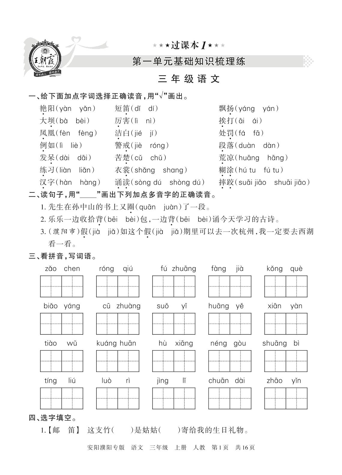 王朝霞期末过课本——第一单元基础知识梳理练三年级上册语文(人教版)_R211123154908009【1】