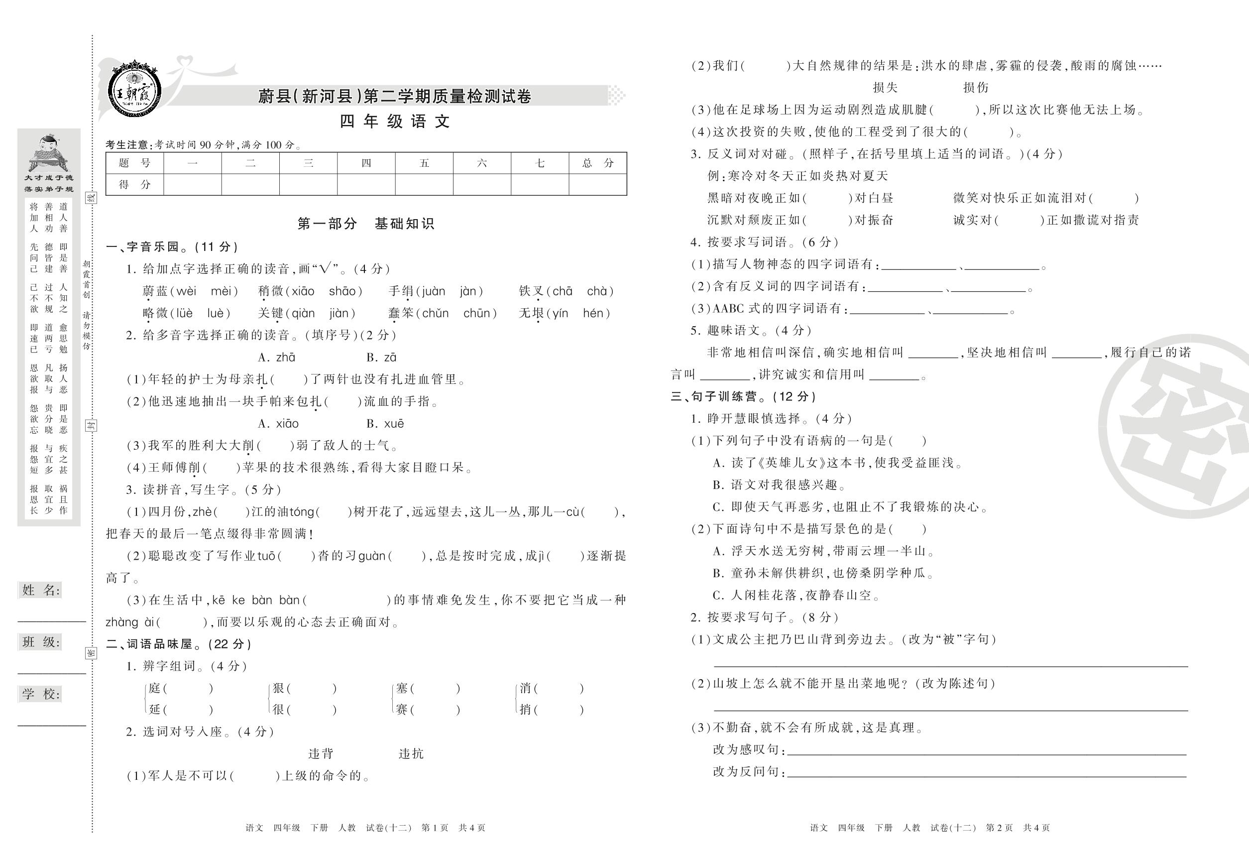 2015-2016学年第二学期张家口市蔚县(新河县)四年级语文试卷(人教版)【12】