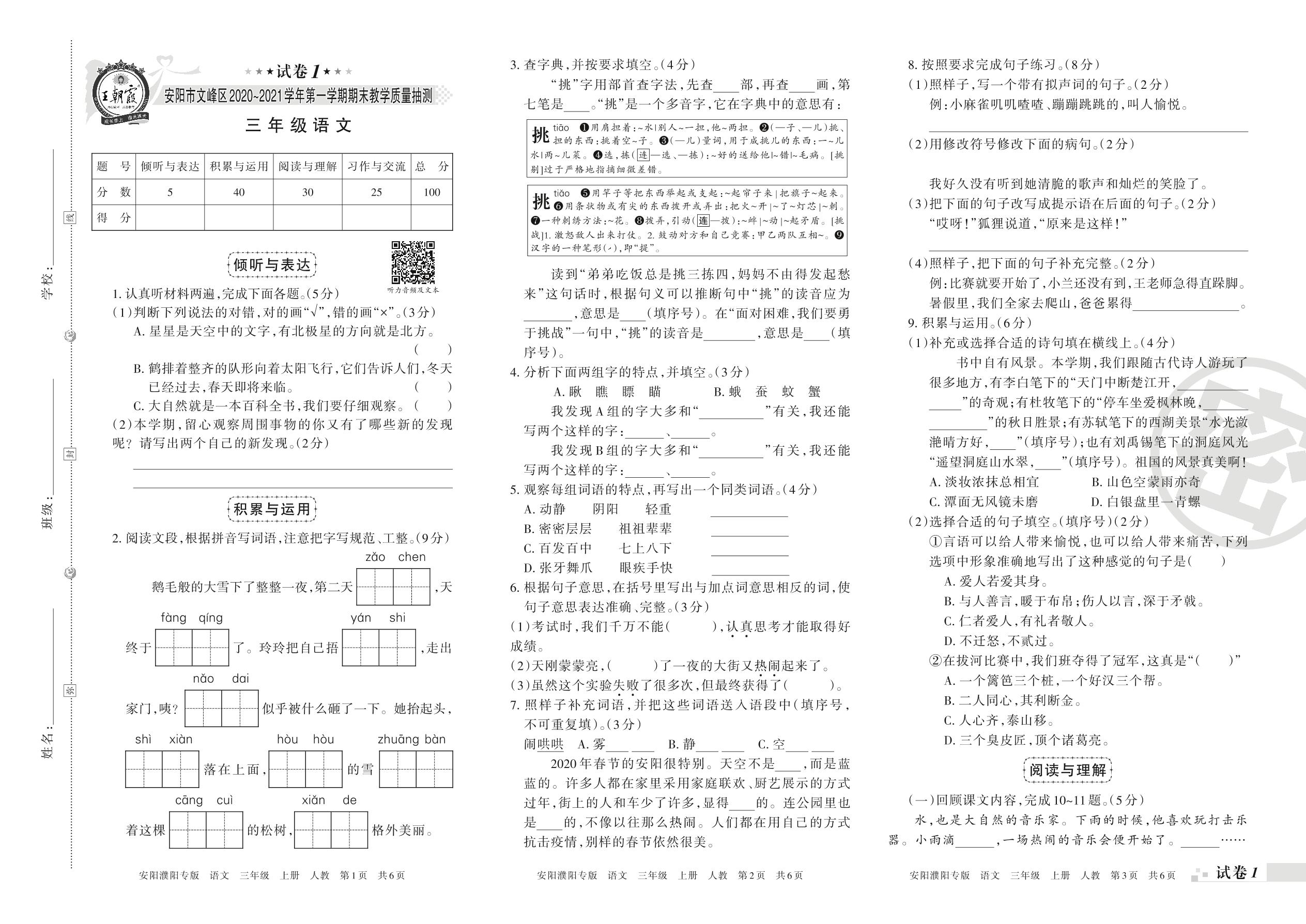 安阳市文峰区2020~2021学年第一学期期末教学质量抽测三年级语文(人教版)【1】