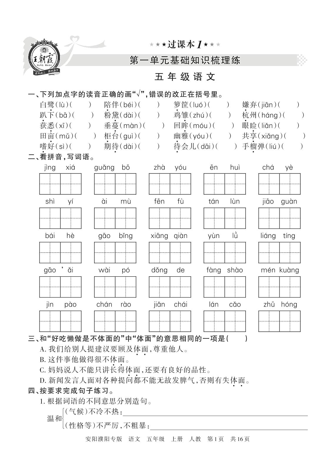 王朝霞期末过课本——第一单元基础知识梳理练五年级上册语文(人教版)_R211123155556323【1】