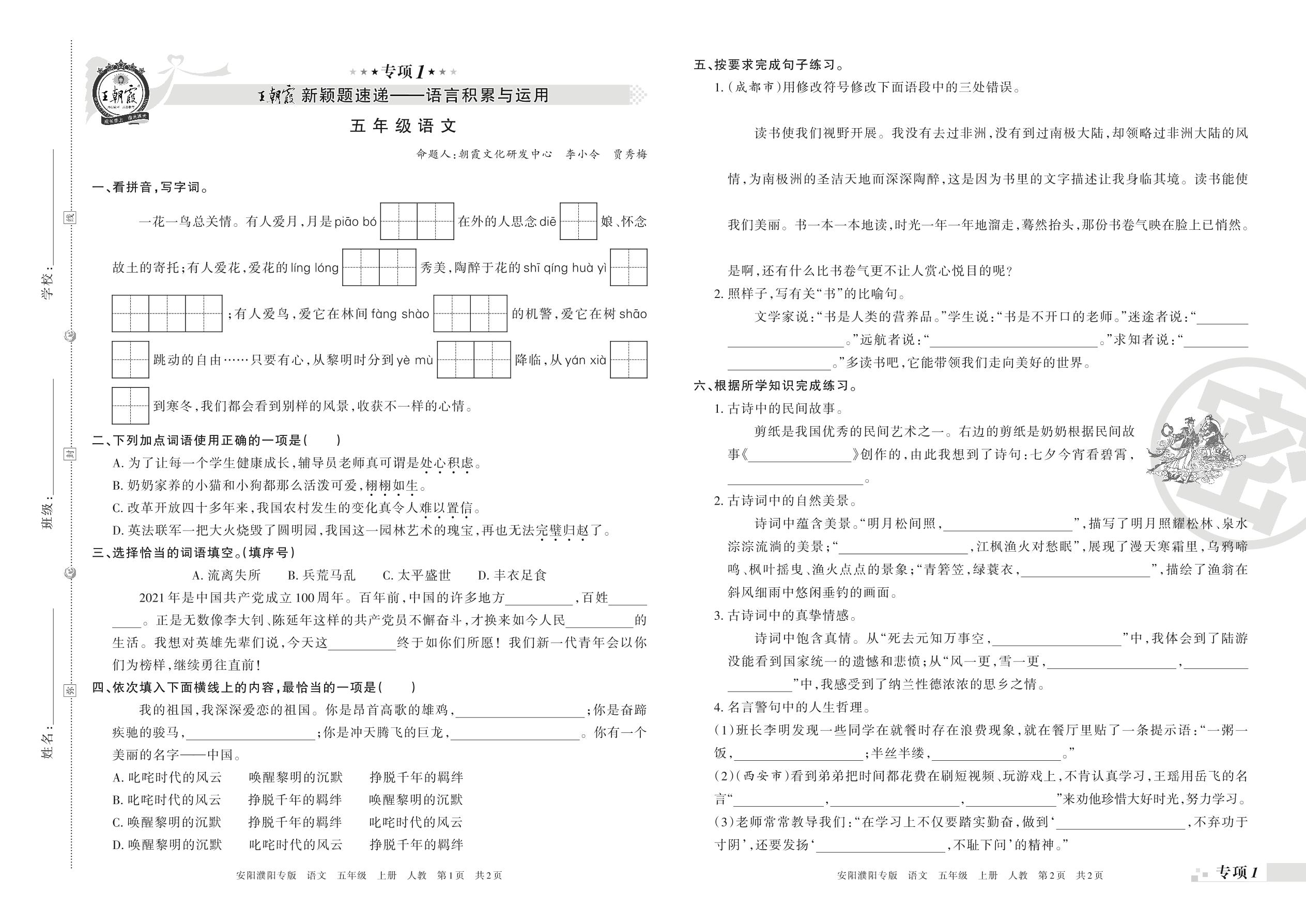 王朝霞期末专项卷——新颖题速递:语言积累与运用五年级上册语文(人教版)_R211123155557388【1】
