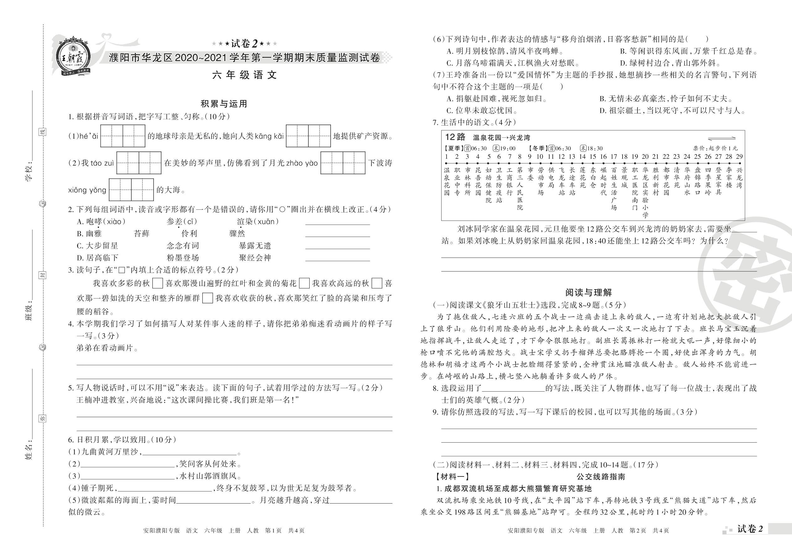 濮阳市华龙区2020~2021学年第一学期期末质量监测试卷六年级语文(人教版)【2】
