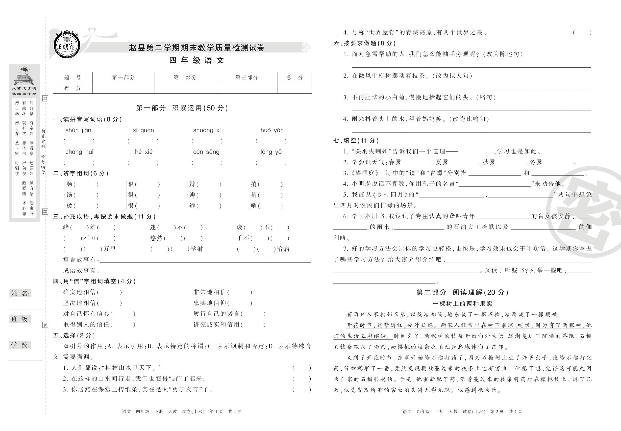 四年级语文人教版下册期末卷