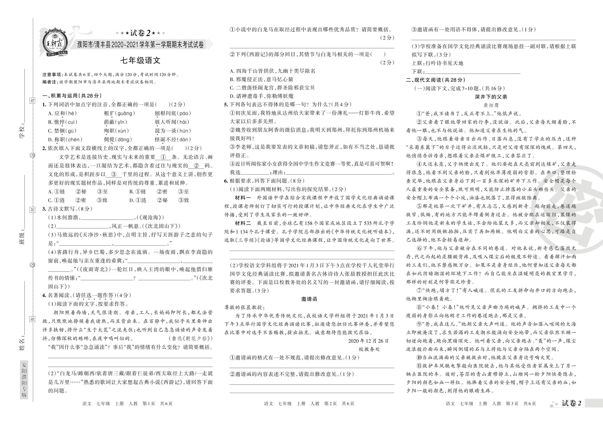 濮阳市、清丰县2020~2021学年第一学期期末考试试卷七年级语文(人教版)【2】