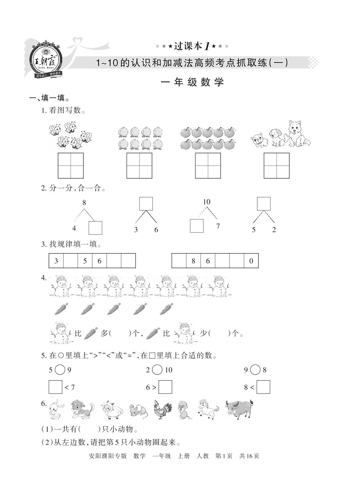 王朝霞期末过课本——1~10的认识和加减法高频考点抓取练(一)一年级上册数学(人教版)_R211124095551742【1】