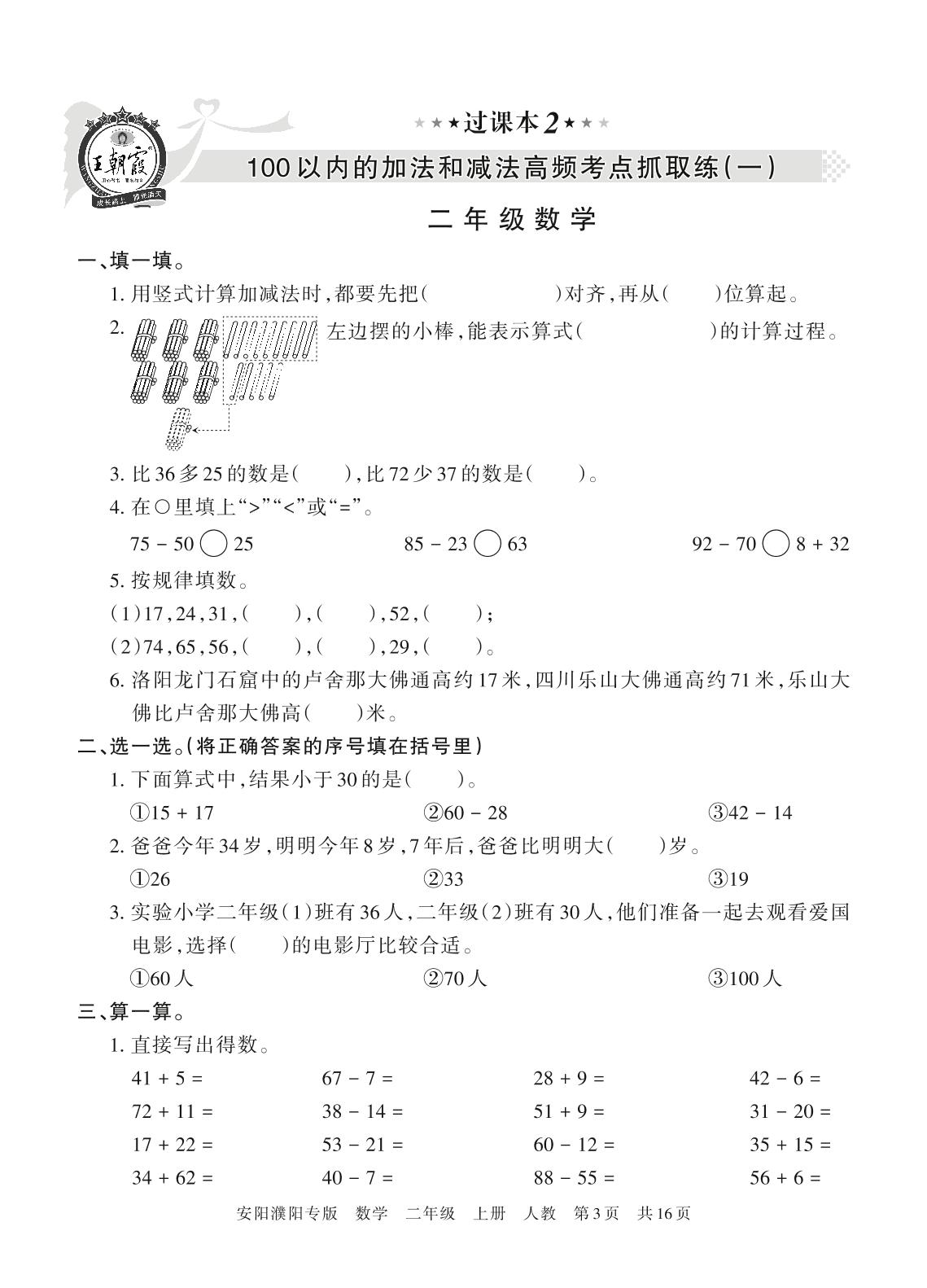 王朝霞期末过课本——100以内的加法和减法高频考点抓取练(一)二年级上册数学(人教版)_R211124095917144【2】