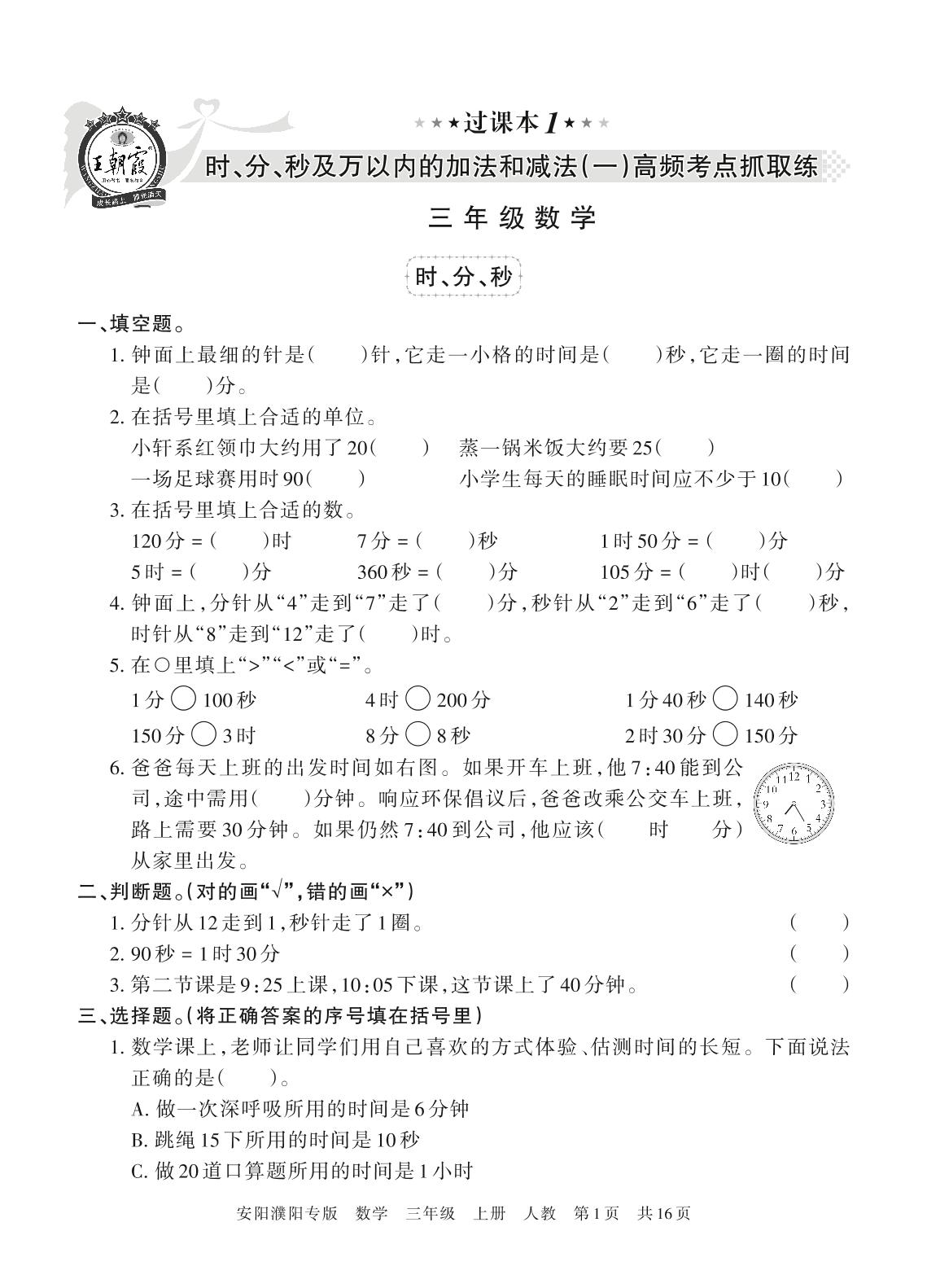 王朝霞期末过课本——时、分、秒及万以内的加法和减法(一)高频考点抓取练三年级上册数学(人教版)【1】