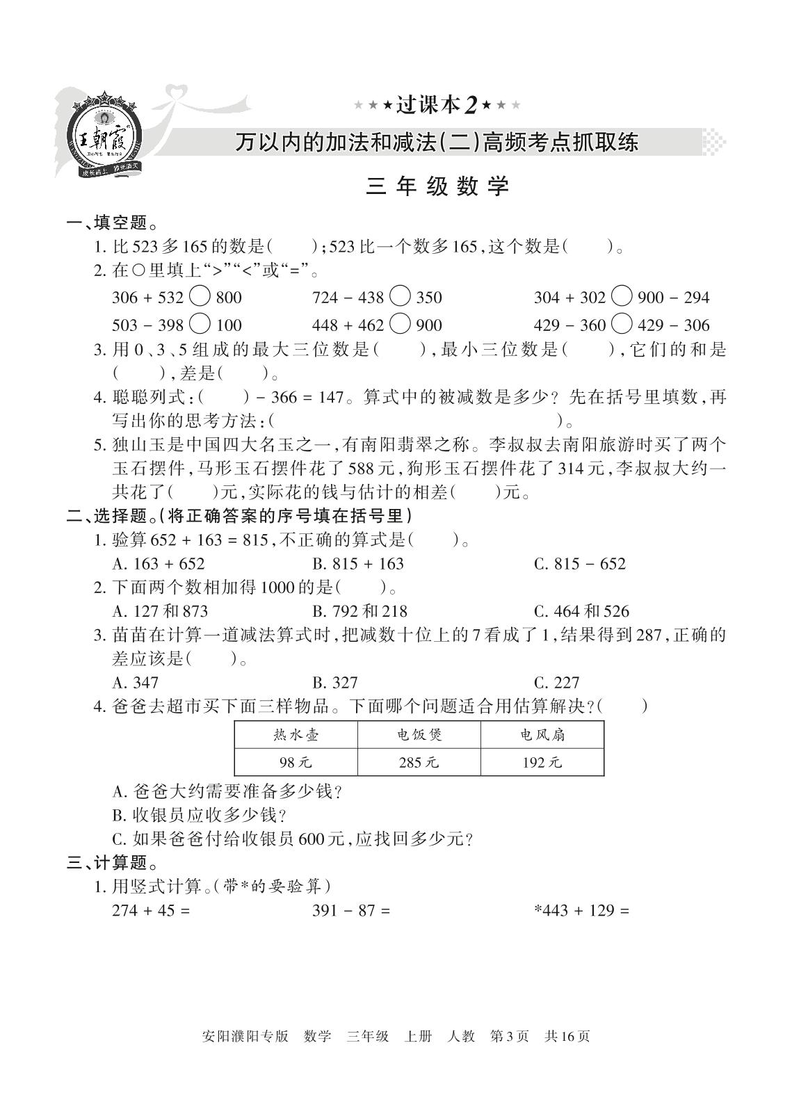 王朝霞期末过课本——万以内的加法和减法(二)高频考点抓取练三年级上册数学(人教版)【2】