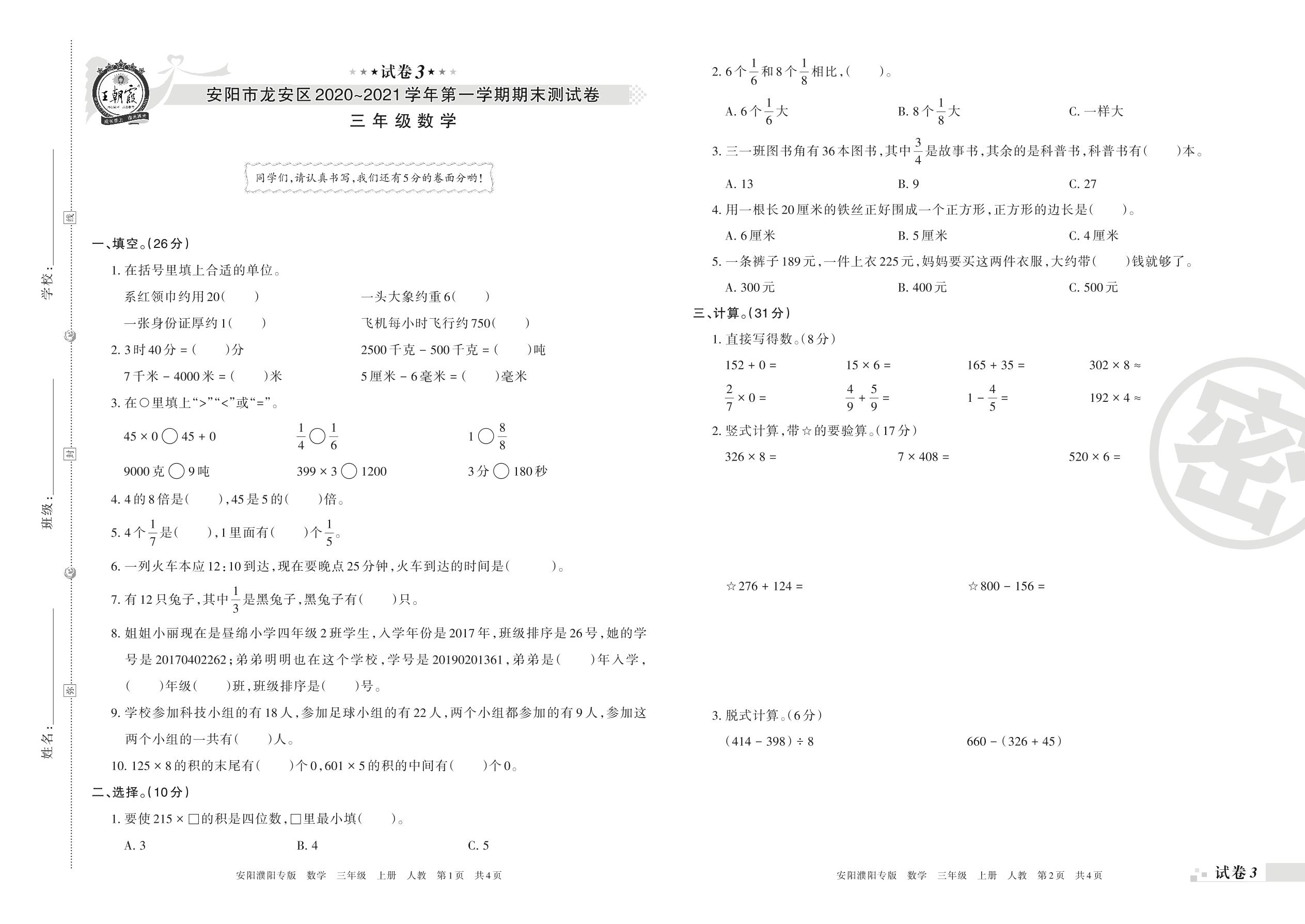 安阳市龙安区2020~2021学年第一学期期末测试卷三年级数学(人教版)【3】
