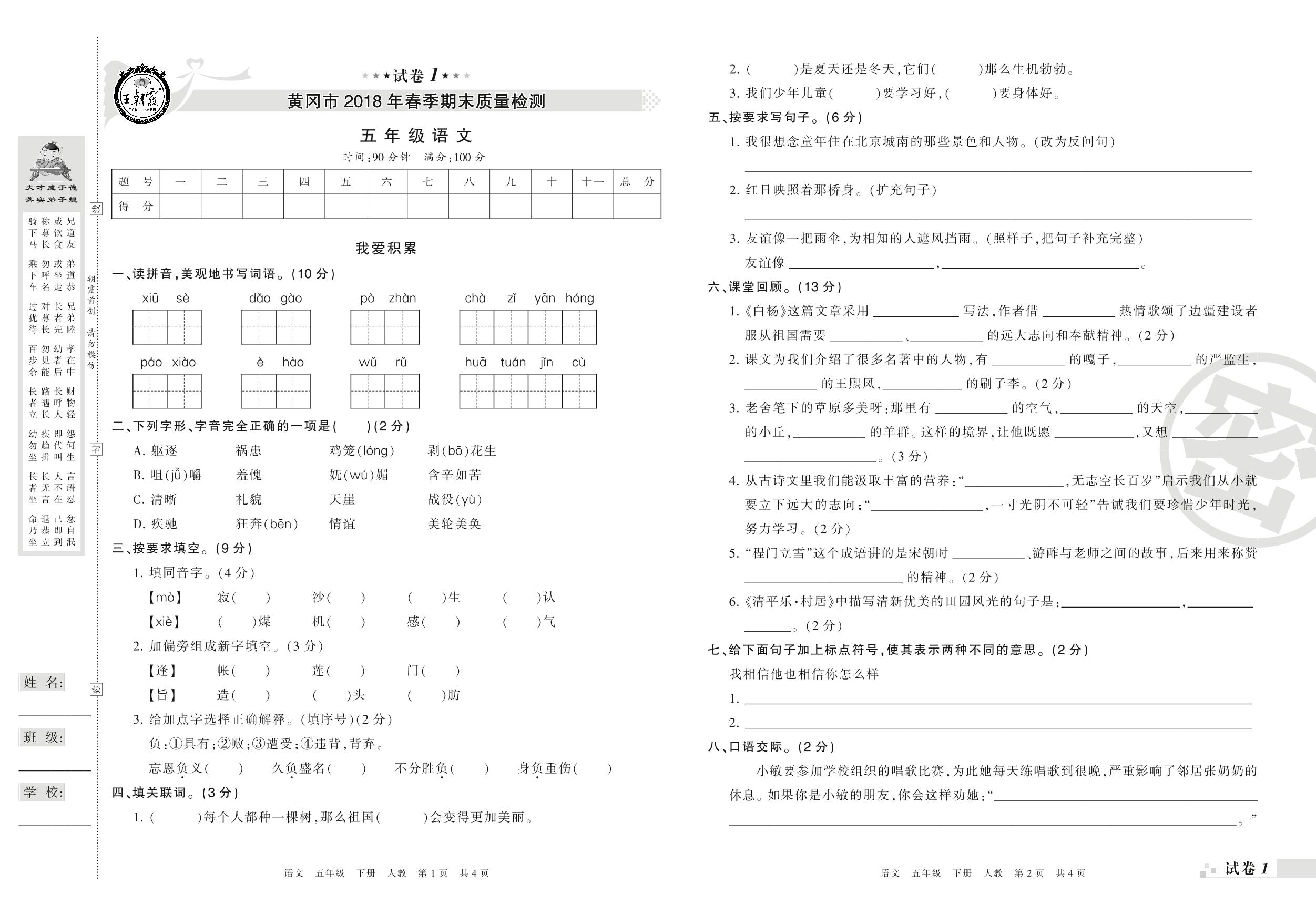2017-2018学年第二学期黄冈市五年级语文试卷(人教版)【1】