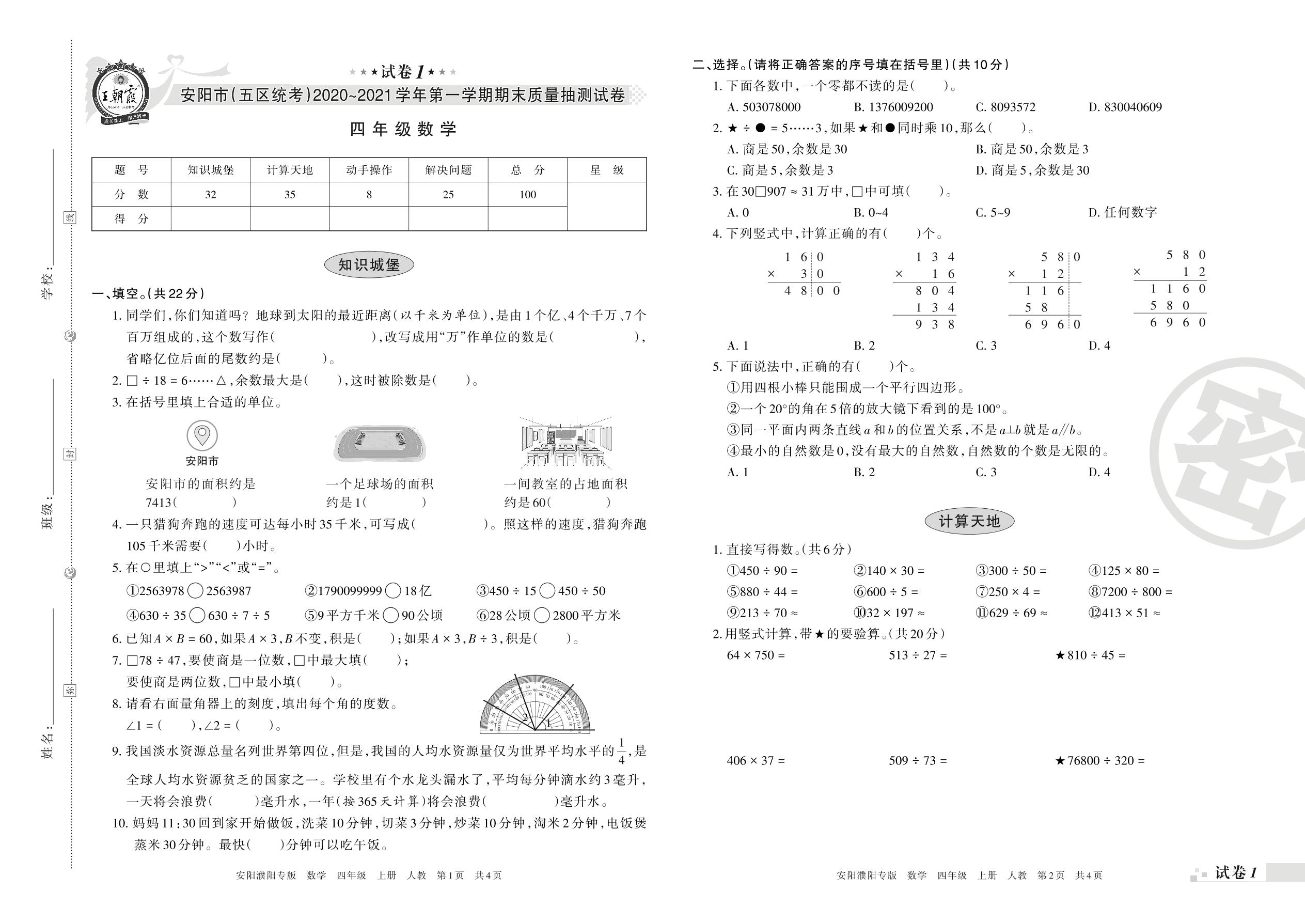 安阳市(五区统考)2020~2021学年第一学期期末质量抽测试卷四年级数学(人教版)【1】