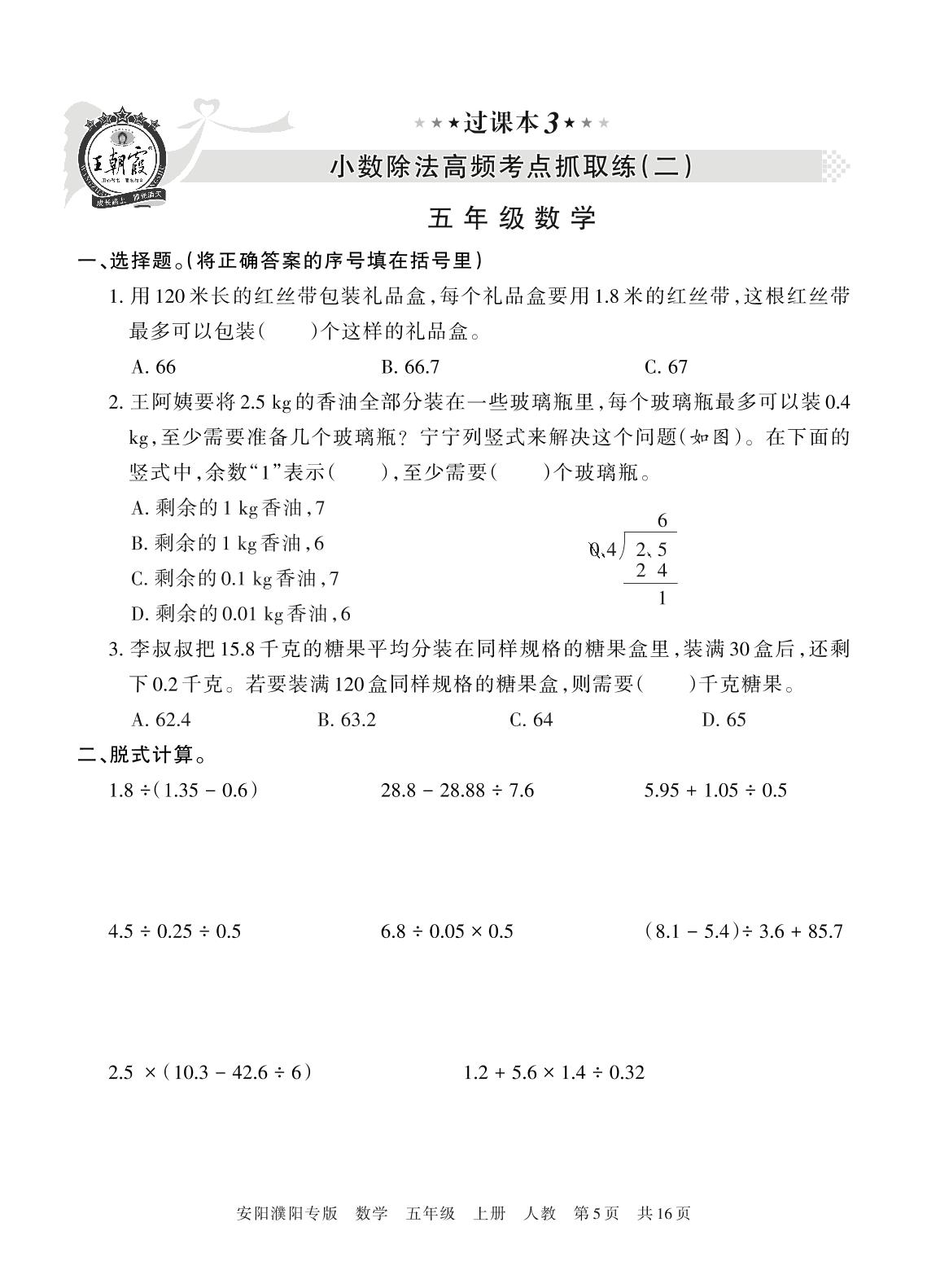 王朝霞期末过课本——小数除法高频考点抓取练(二)五年级上册数学(人教版)【3】