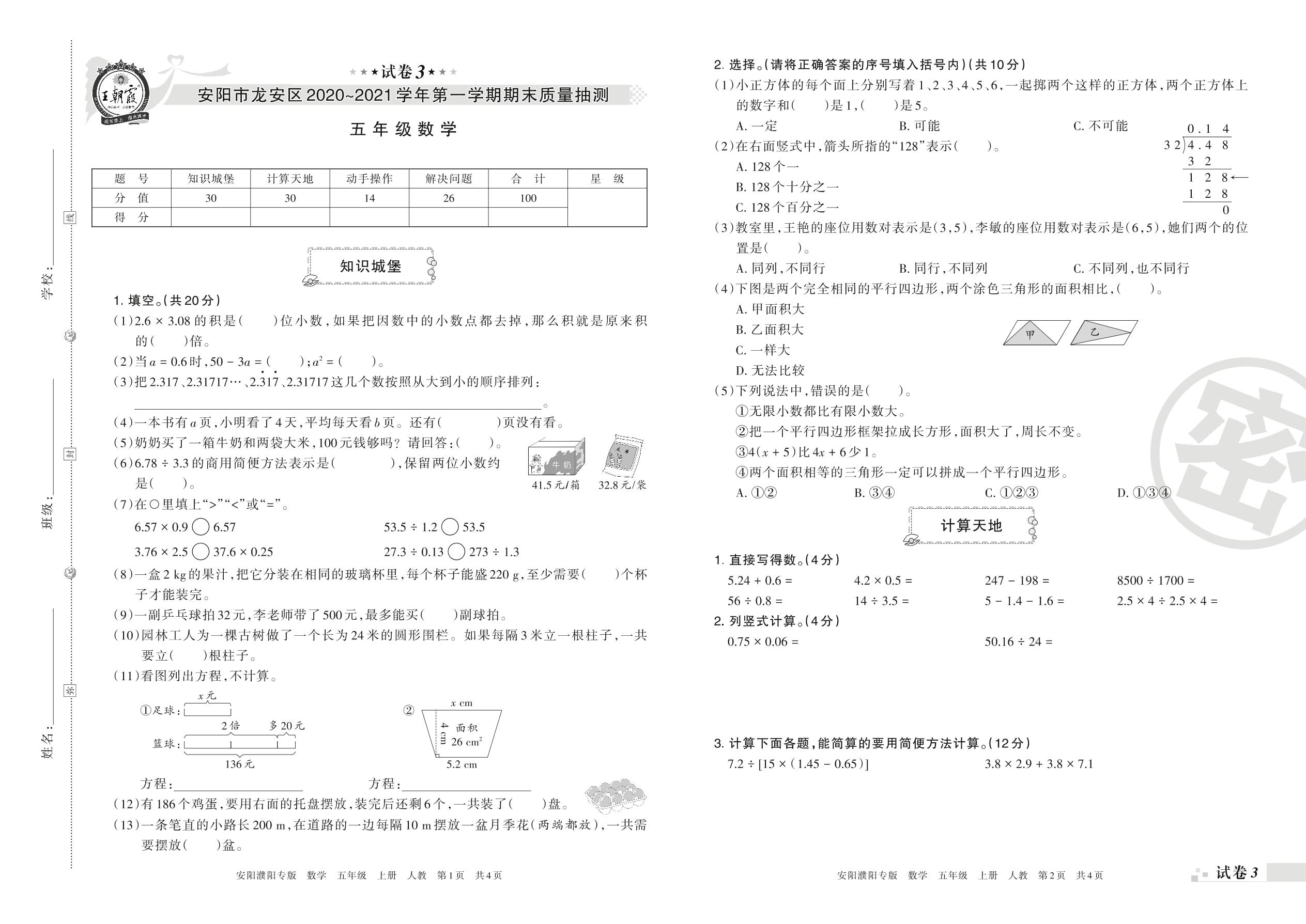 安阳市龙安区2020~2021学年第一学期期末质量抽测五年级数学(人教版)【3】