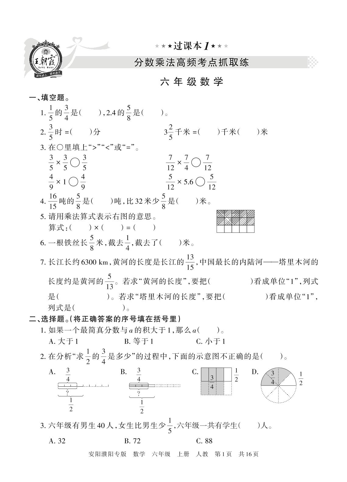 王朝霞期末过课本——分数乘法高频考点抓取练六年级上册数学(人教版)_R211124101325171【1】