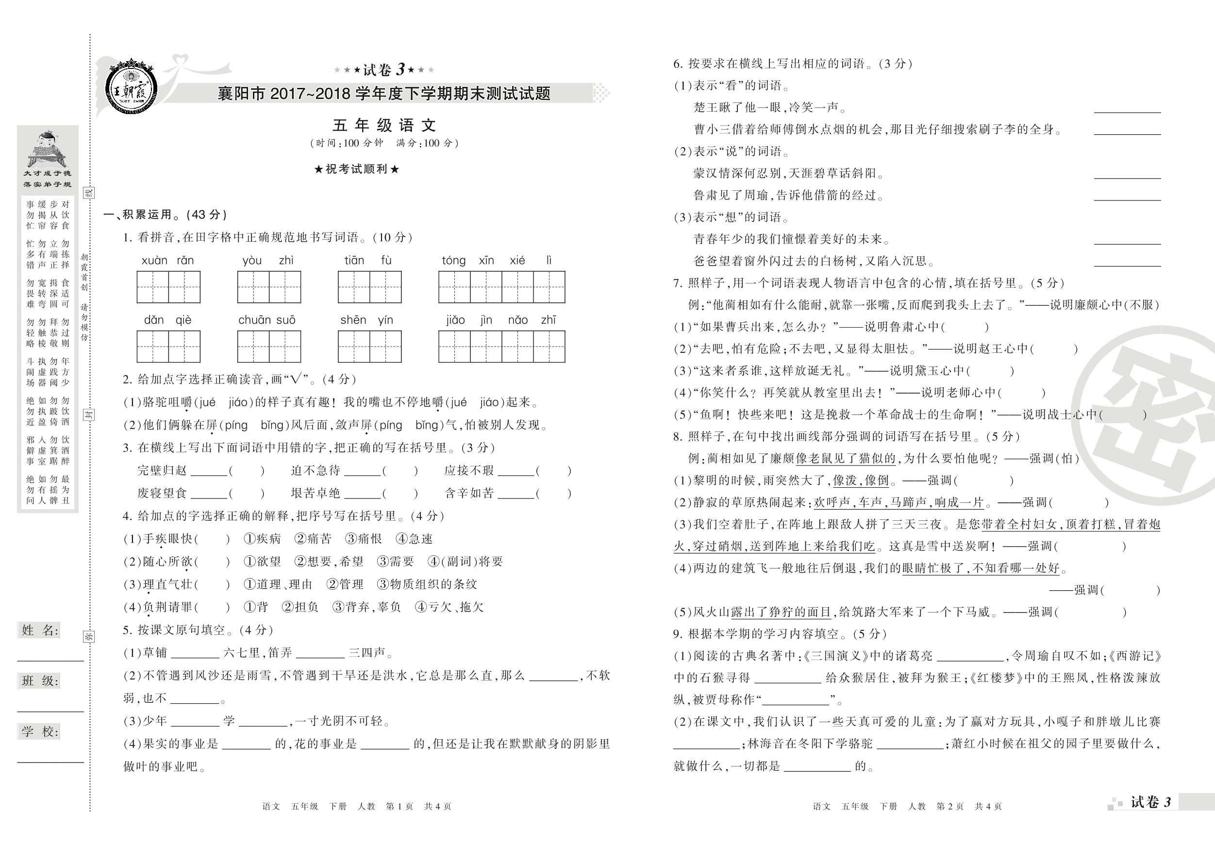 2017-2018学年第二学期襄阳市五年级语文试卷(人教版)【3】