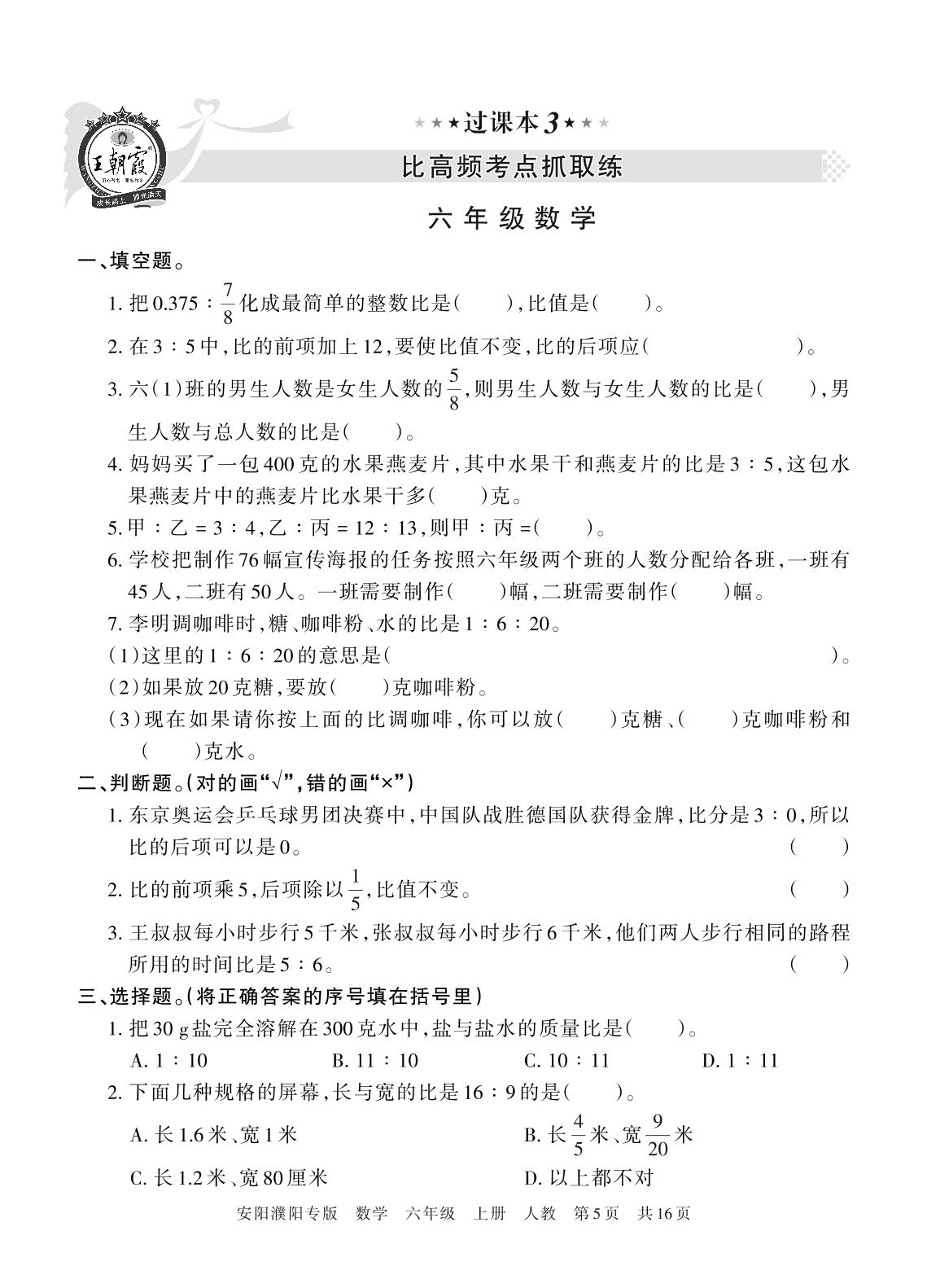 王朝霞期末过课本——比高频考点抓取练六年级上册数学(人教版)【3】
