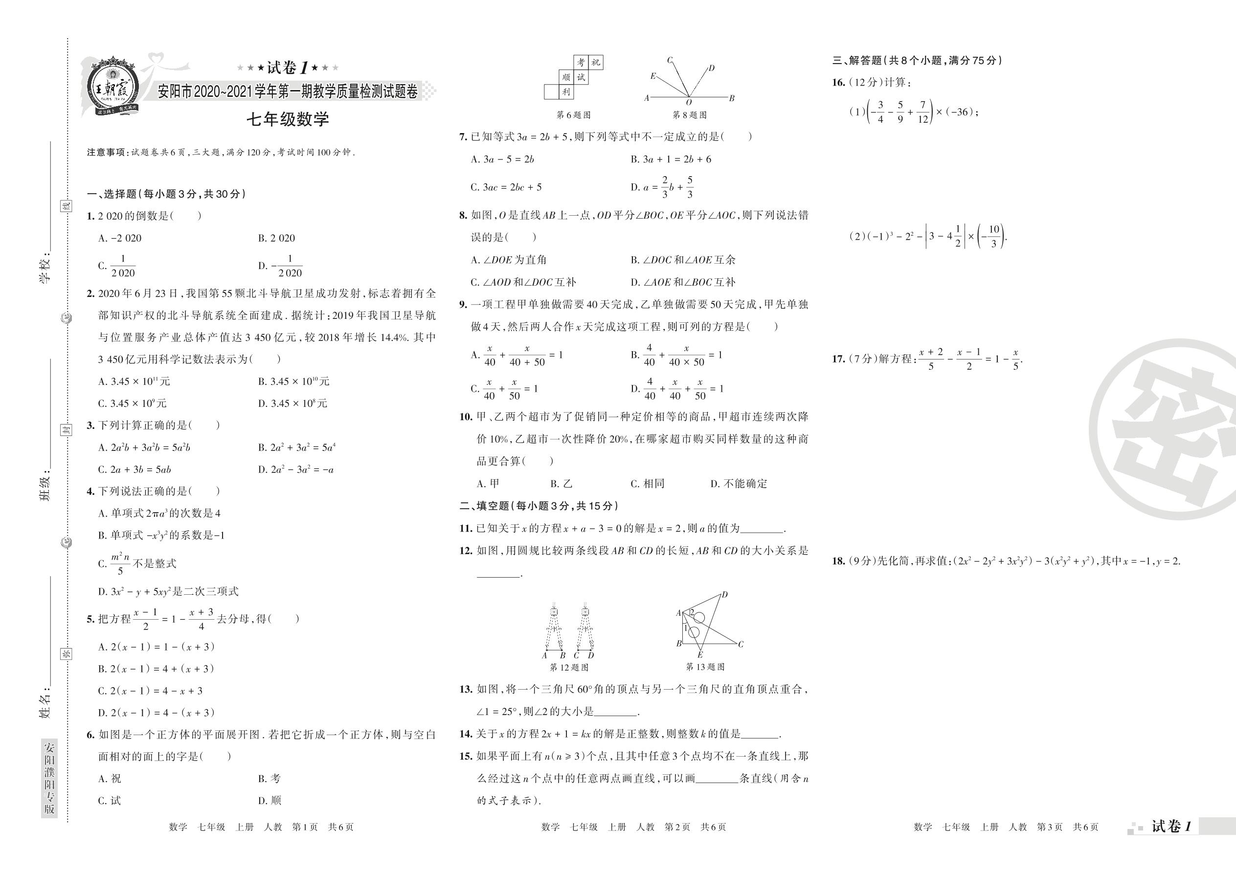 安阳市2020~2021学年第一期教学质量检测试题卷七年级数学(人教版)【1】
