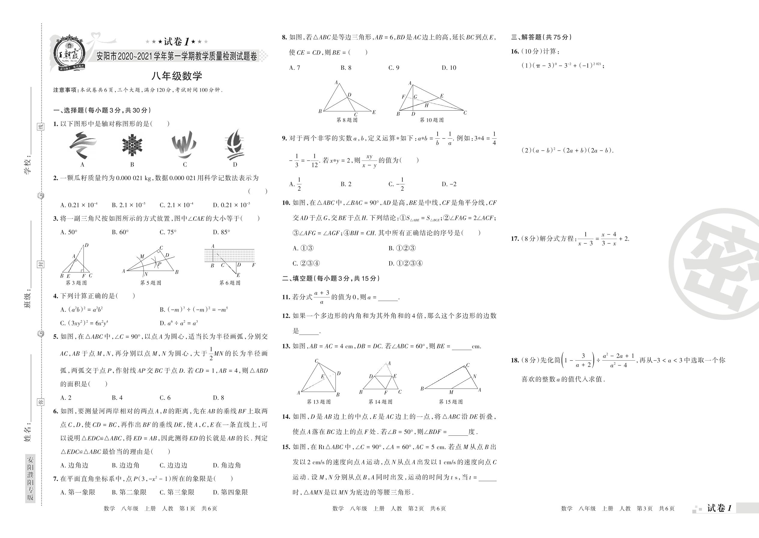 安阳市2020~2021学年第一学期教学质量检测试题卷八年级数学(人教版)【1】