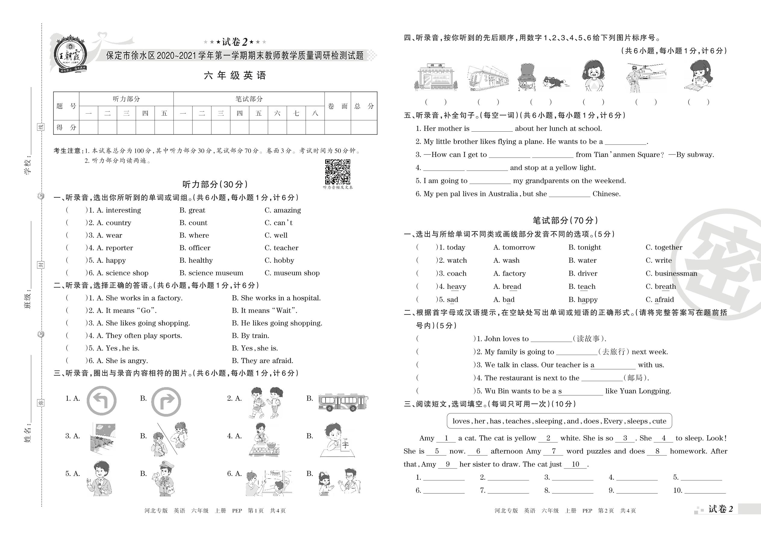 保定市徐水区2020~2021学年第一学期期末教师教学质量调研检测试题六年级英语(人教PEP版)【2】