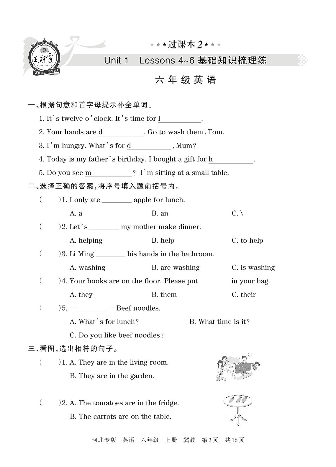 王朝霞期末过课本——Unit 1 Lessons 4~6 基础知识梳理练六年级上册英语(冀教版)【2】