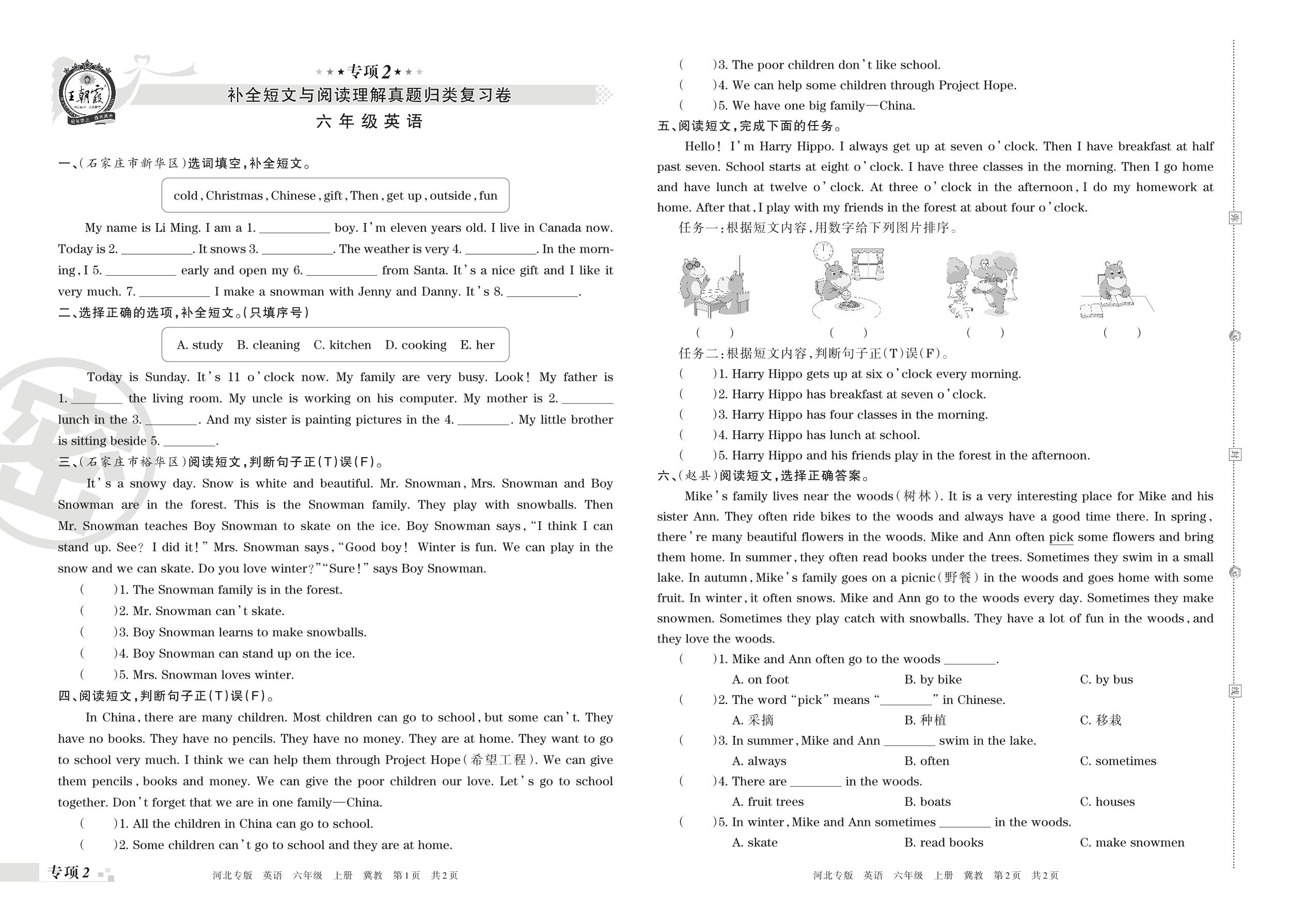 王朝霞期末专项卷——补全短文与阅读理解真题归类复习卷六年级上册英语(冀教版)【2】