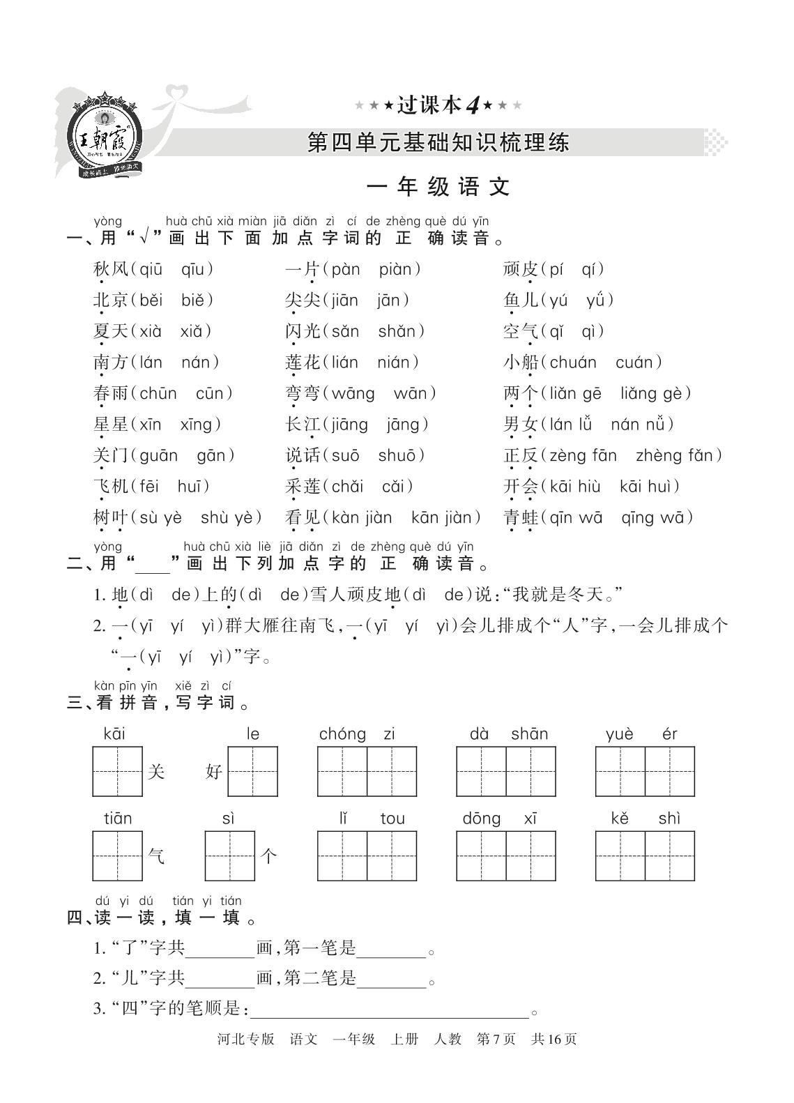 王朝霞期末过课本——第四单元基础知识梳理练一年级上册语文(人教版)_R211124111833278【4】