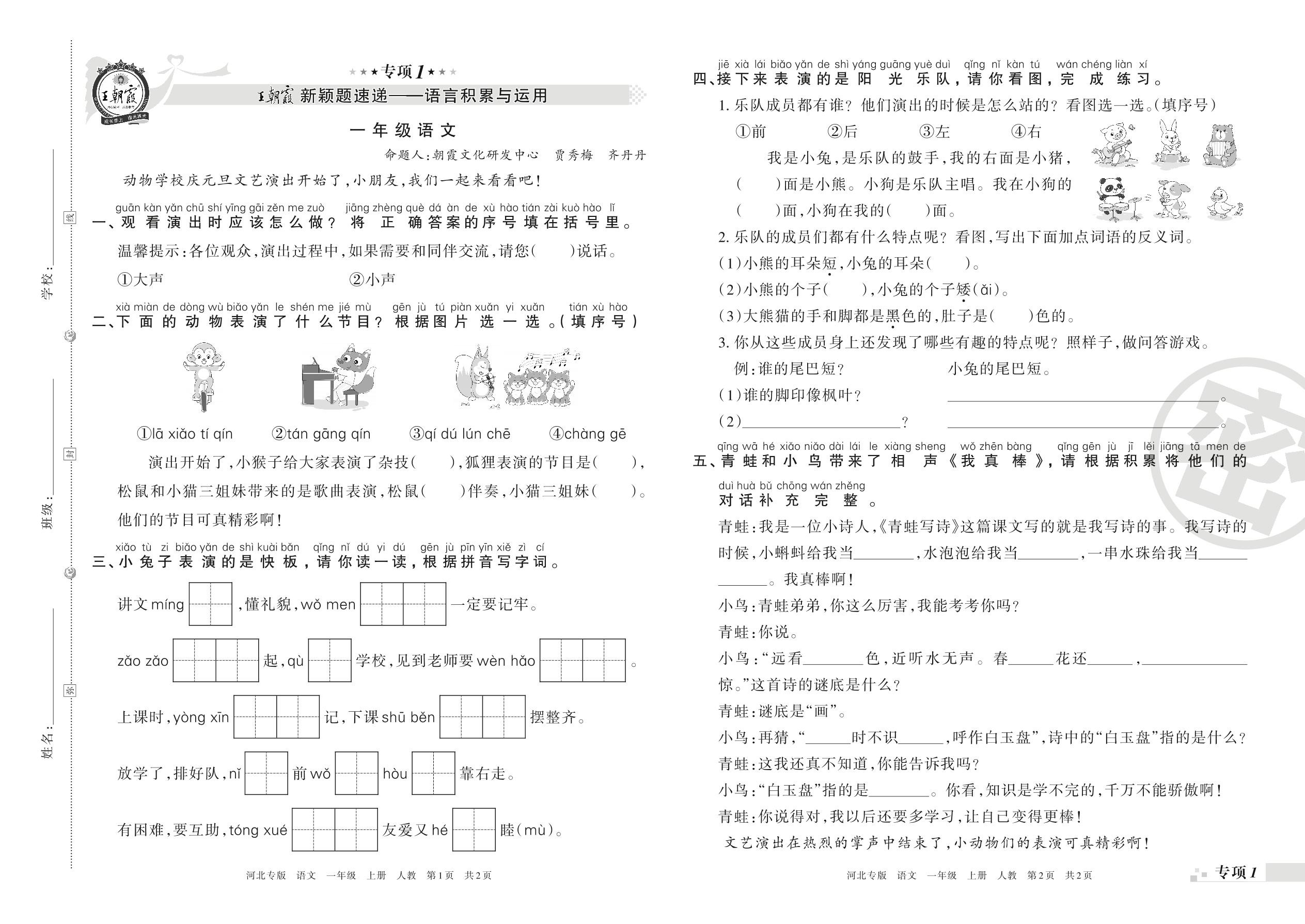 王朝霞期末专项卷——新颖题速递:语言积累与运用一年级上册语文(人教版)_R211124111833521【1】