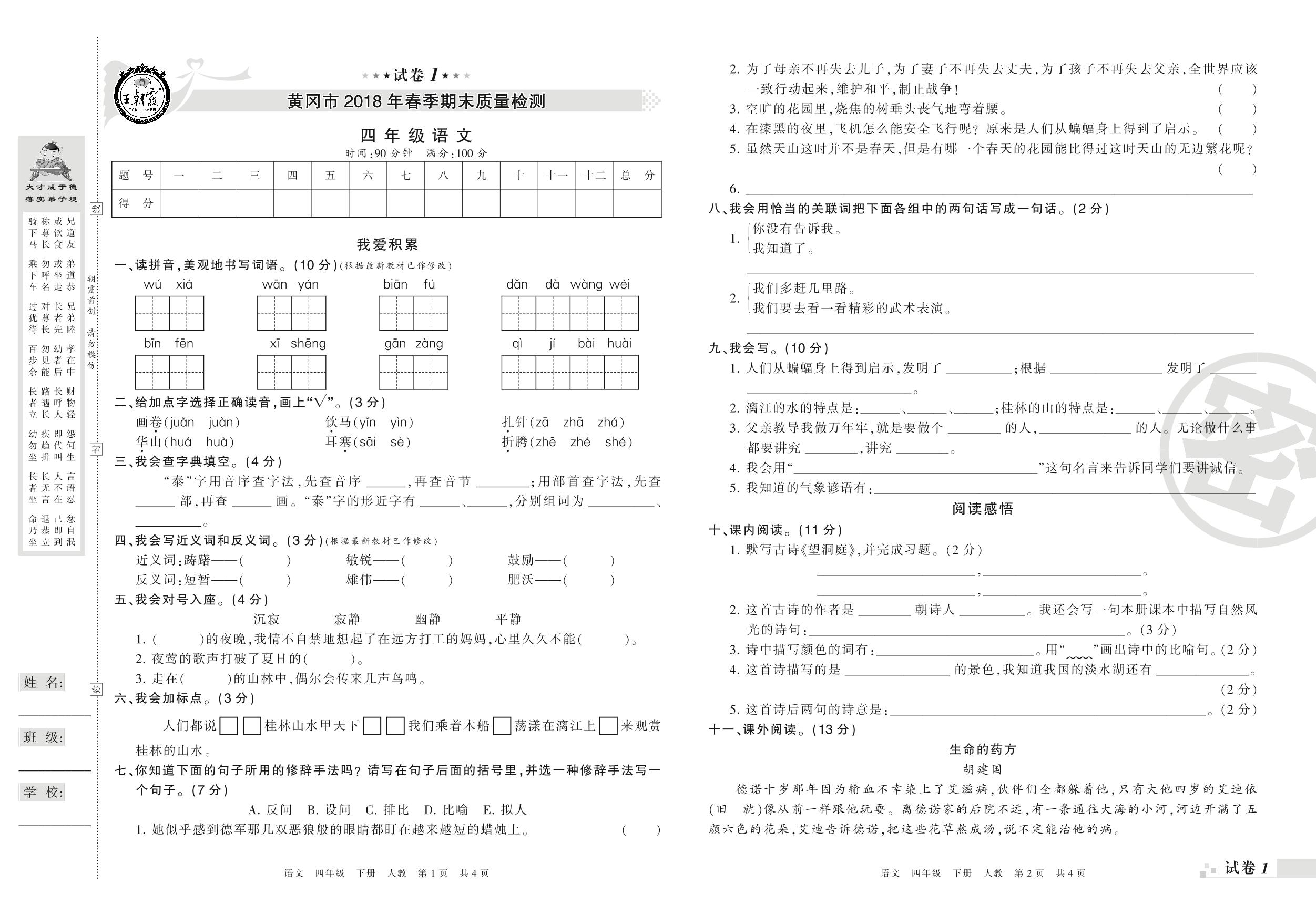 2017-2018学年第二学期黄冈市四年级语文试卷(人教版)【1】