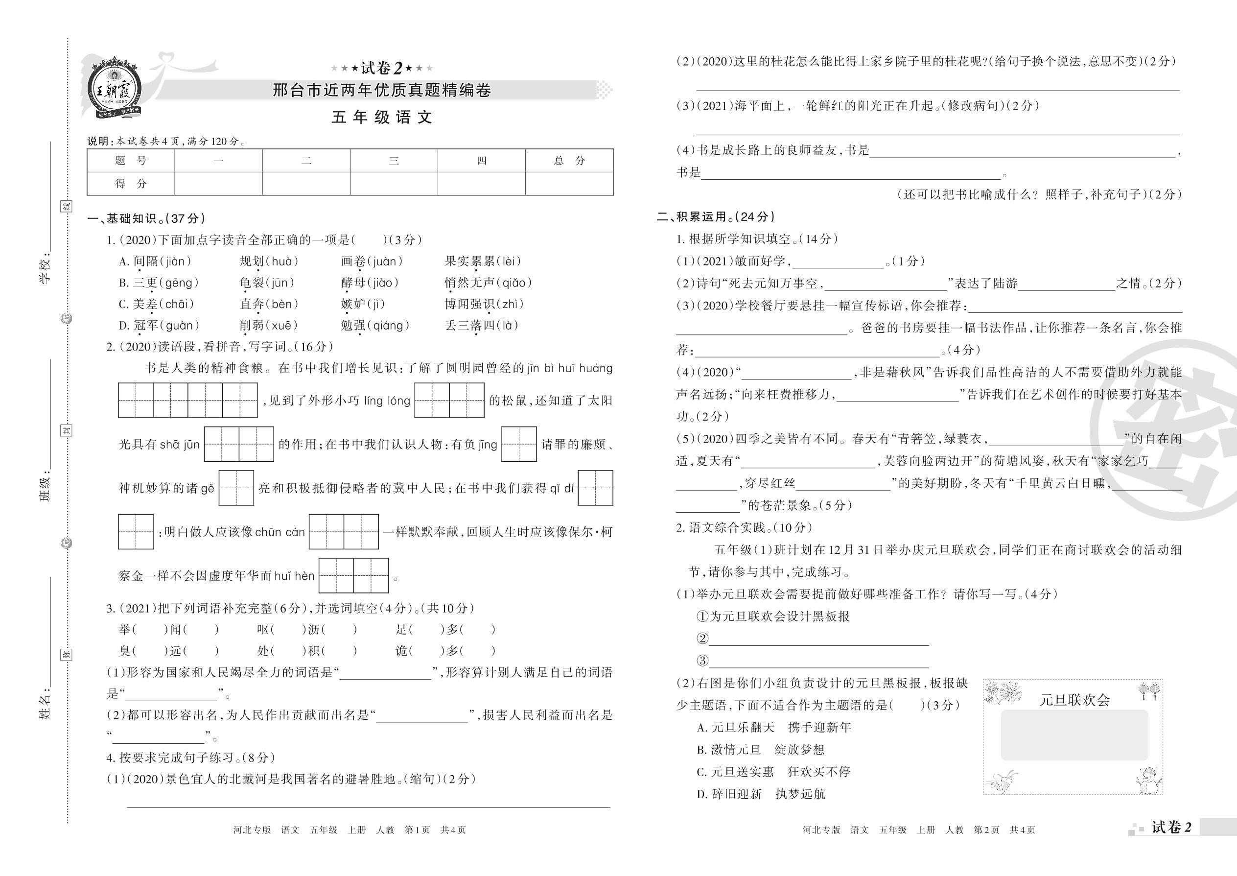 邢台市近两年优质真题精编卷五年级上册语文(人教版)【2】
