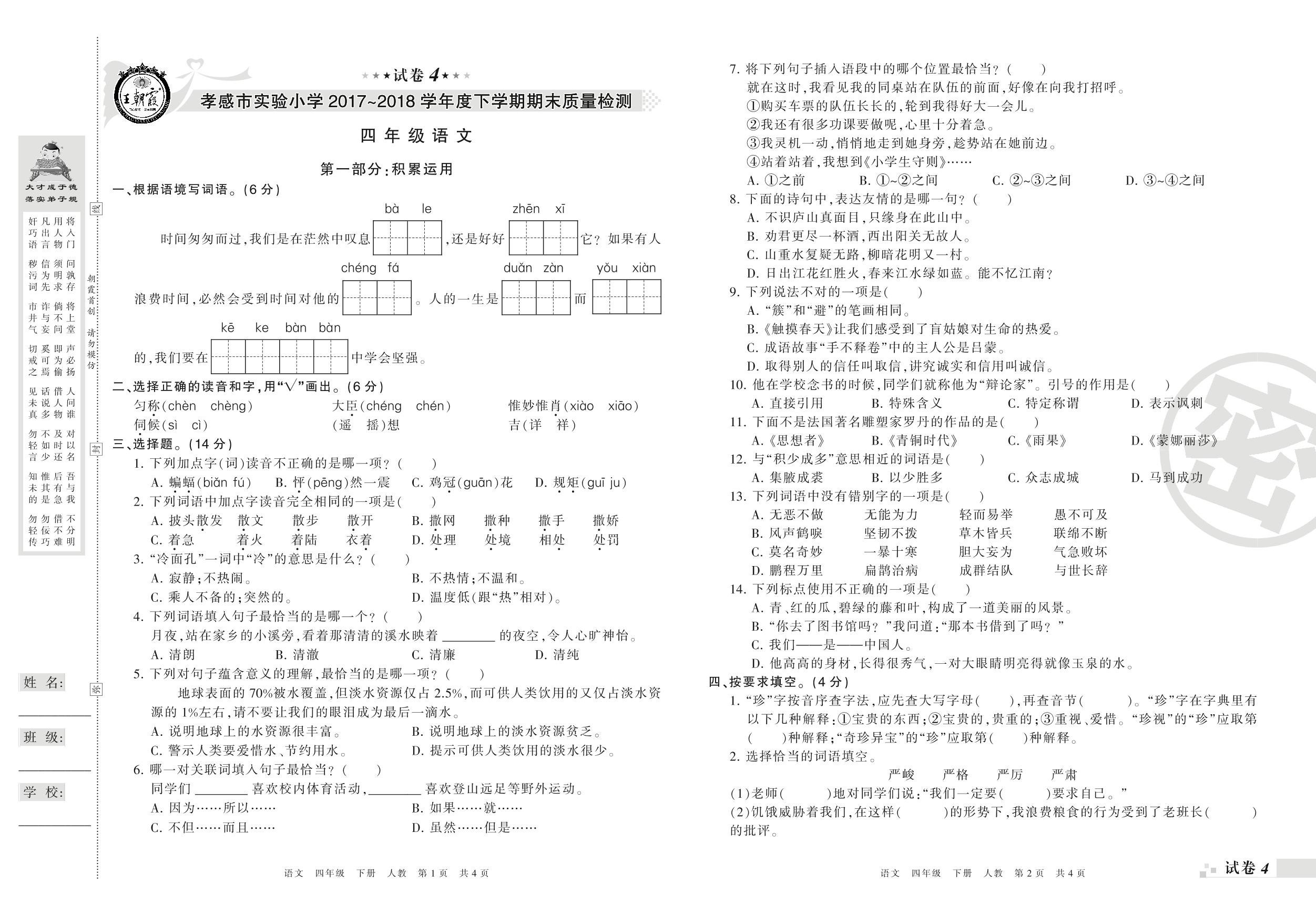 2017-2018学年第二学期孝感市实验小学四年级语文试卷(人教版)【4】