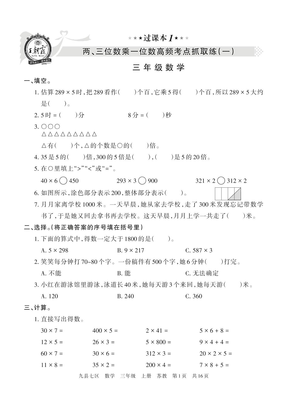王朝霞期末过课本——两、三位数乘一位数高频考点抓取练(一)三年级上册数学(苏教版)_R211124154936774【1】