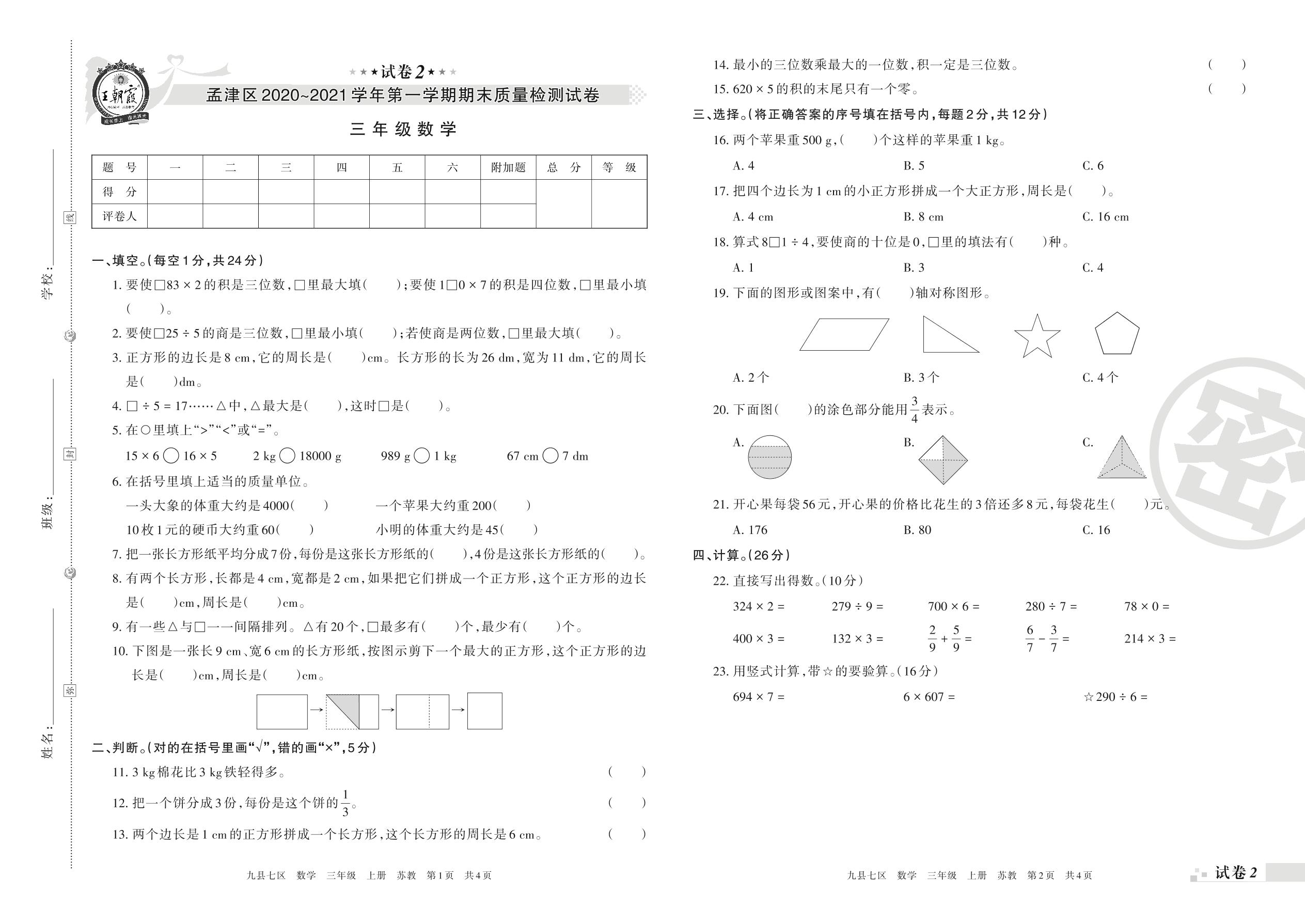 孟津区2020~2021学年第一学期期末质量检测试卷三年级数学(苏教版)【2】