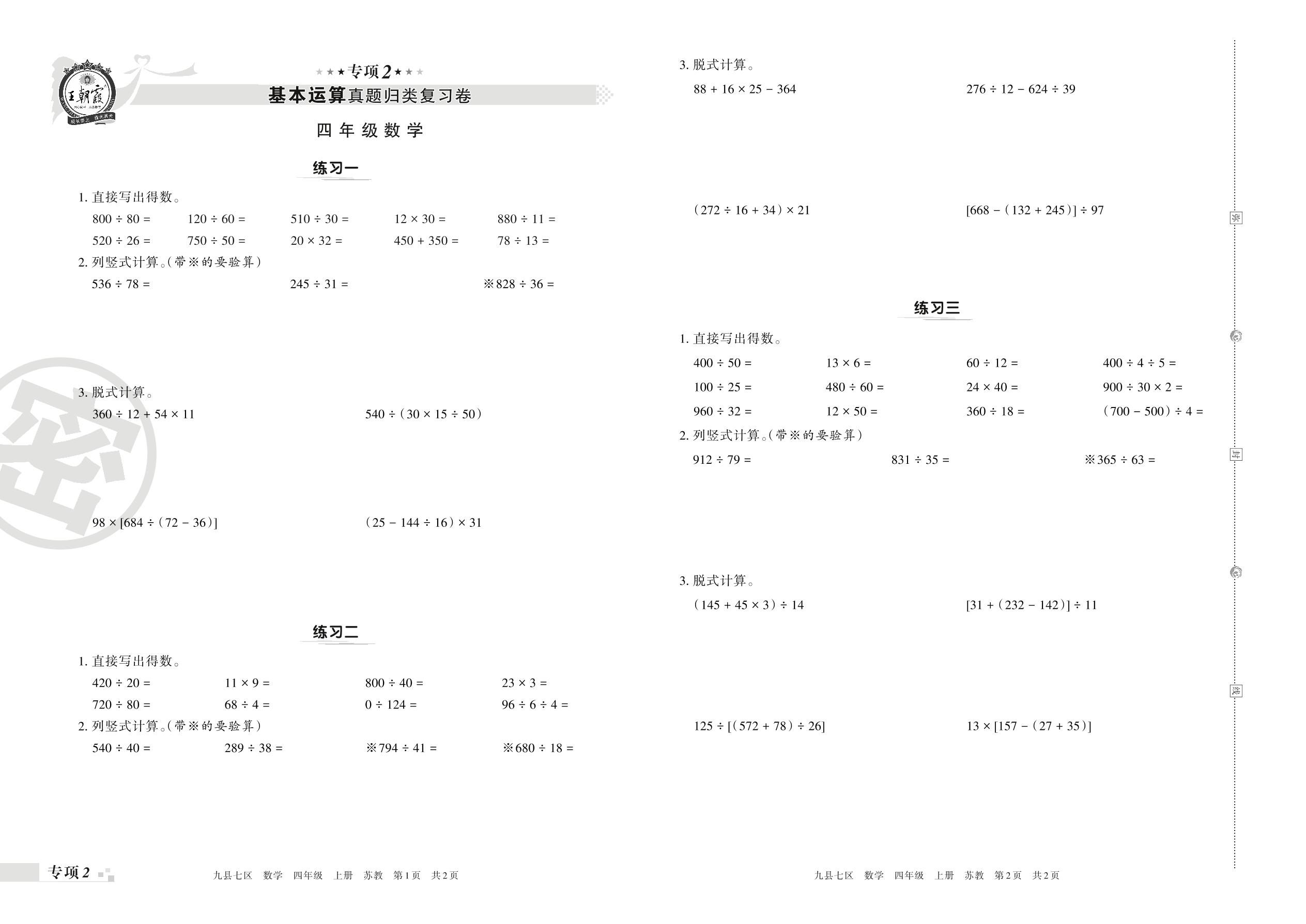 王朝霞期末专项卷——基本运算真题归类复习卷四年级上册数学(苏教版)【2】
