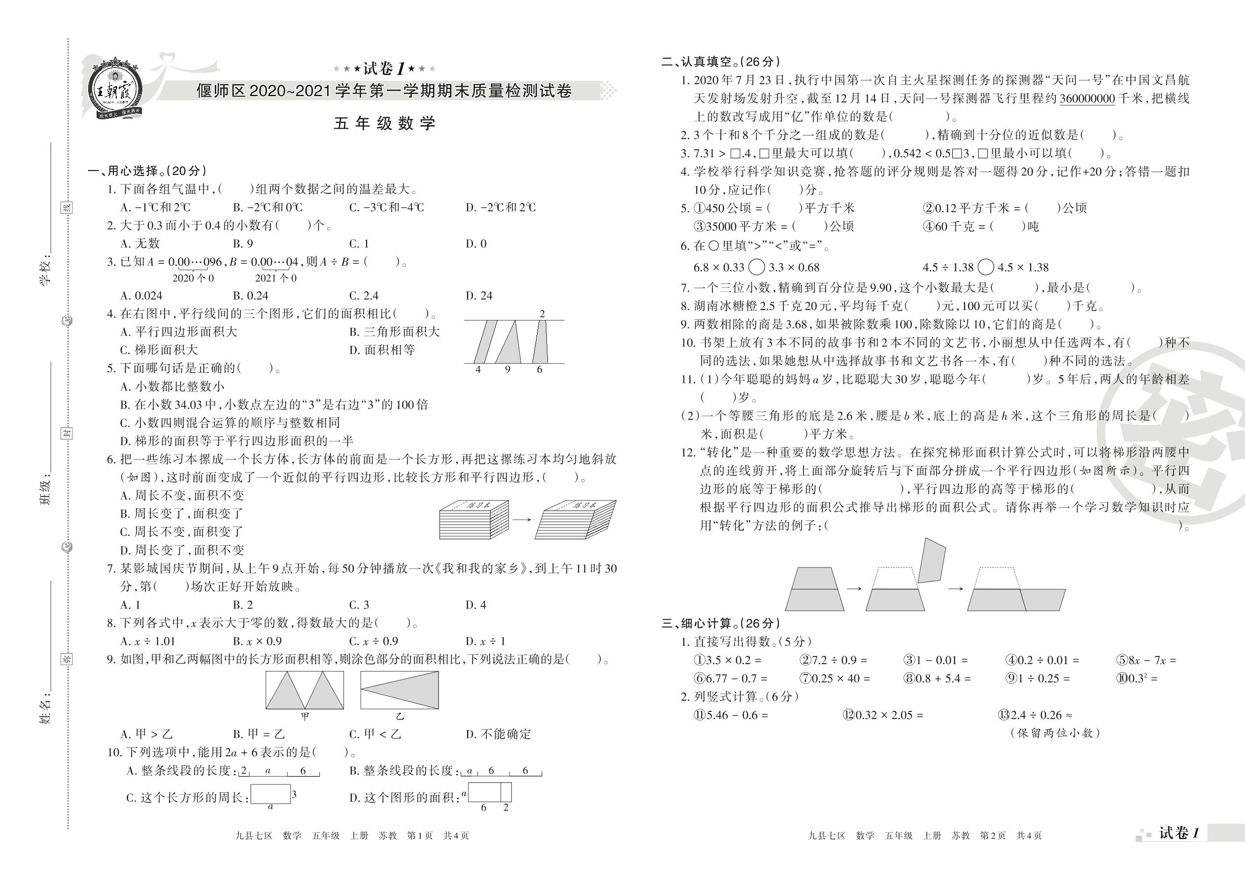 偃师区2020~2021学年第一学期期末质量检测试卷五年级数学(苏教版)【1】