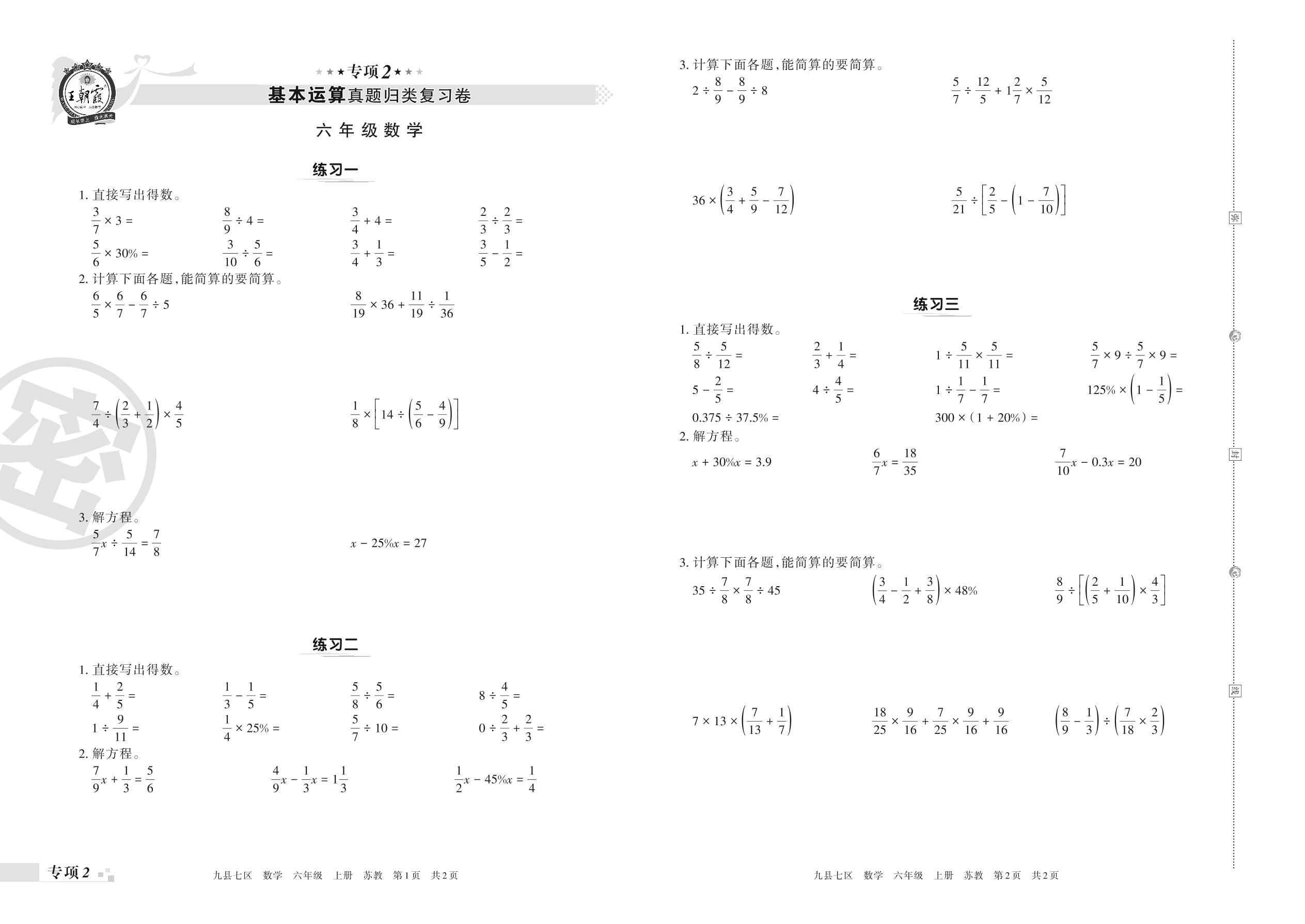 王朝霞期末专项卷——基本运算真题归类复习卷六年级上册数学(苏教版)【2】